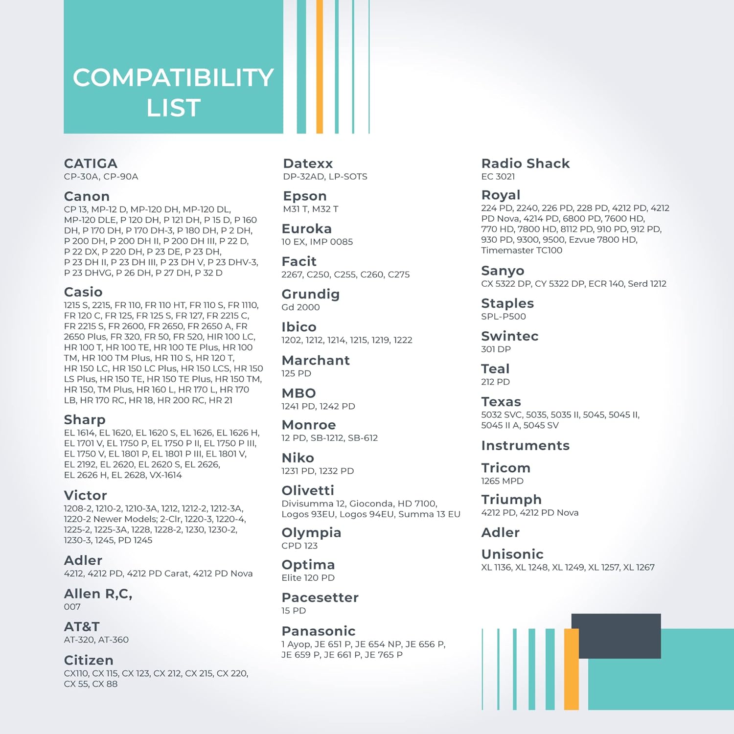 - Fits popular caclulators including Sharp EL-1750V, EL-1801V, and more, Casio HR-170RC Plus, HR-300RC, HR-200RC, HR-100TM, HR-150TM, and more, Canon P23-DH V, P23-DHV-3, P170-DH3, and more, Catiga CP30A, CP90A