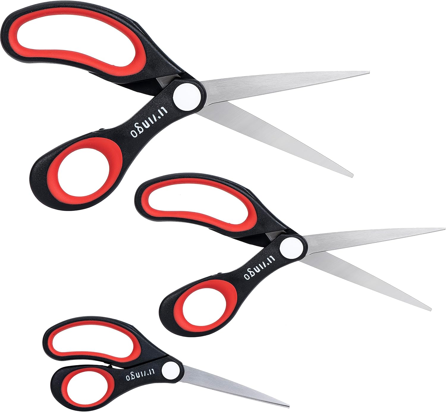 - MULTIPURPOSE: Heavy duty kitchen scissors that can be used to cut meat products such as chicken, beef and fish, as well as various vegetables. The other three multi-purpose scissors are suitable for multiple scenarios and can be used to cut fabric, leather, cardboard, tin foil, unwrap packages, paper, poster board, ribbons, crafting, college classes craft projects and other items. You can give this set of scissors as a gift to him or her.