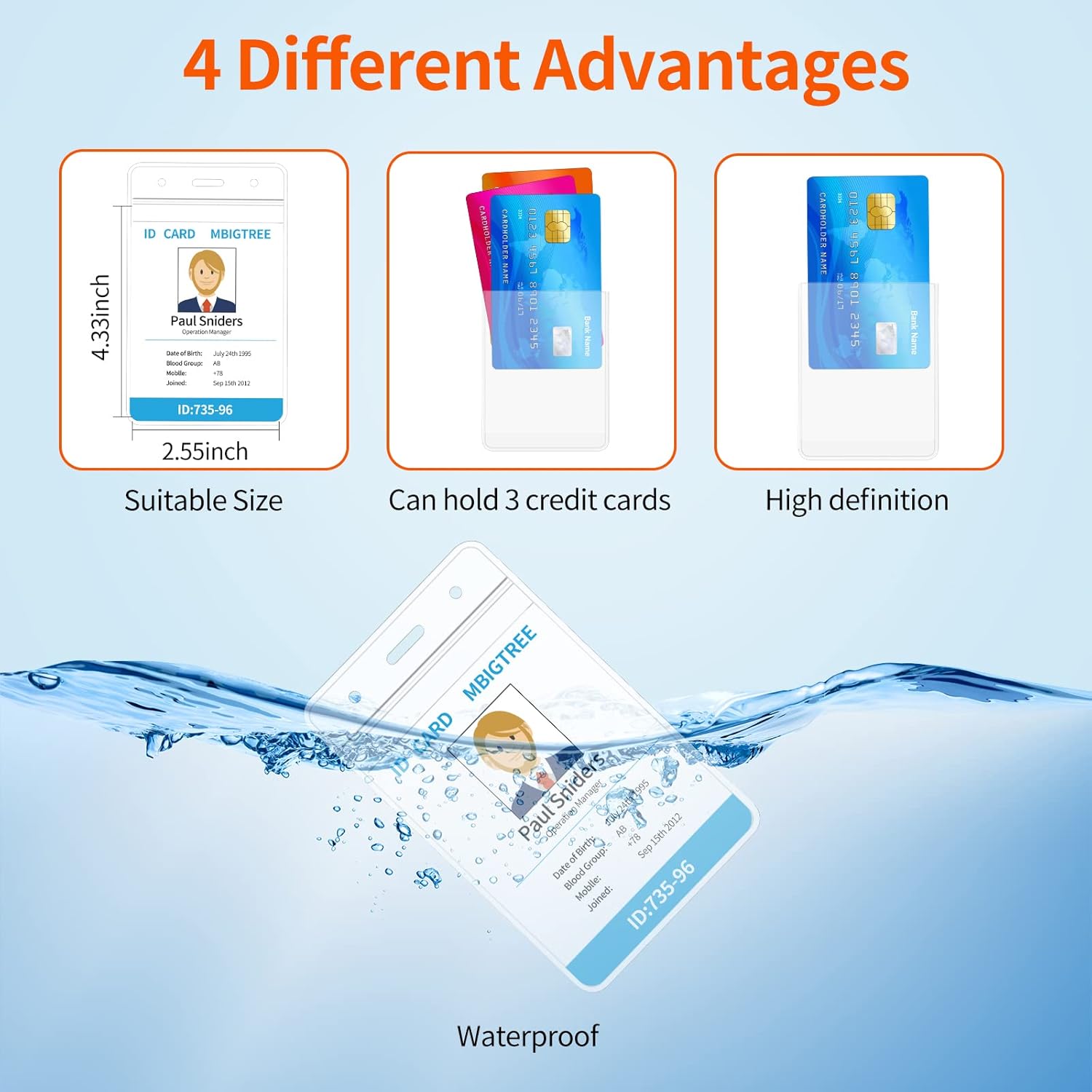 - [ID Card Holder]: This card holder can hold 3 cards, with the advantages of waterproof, high definition