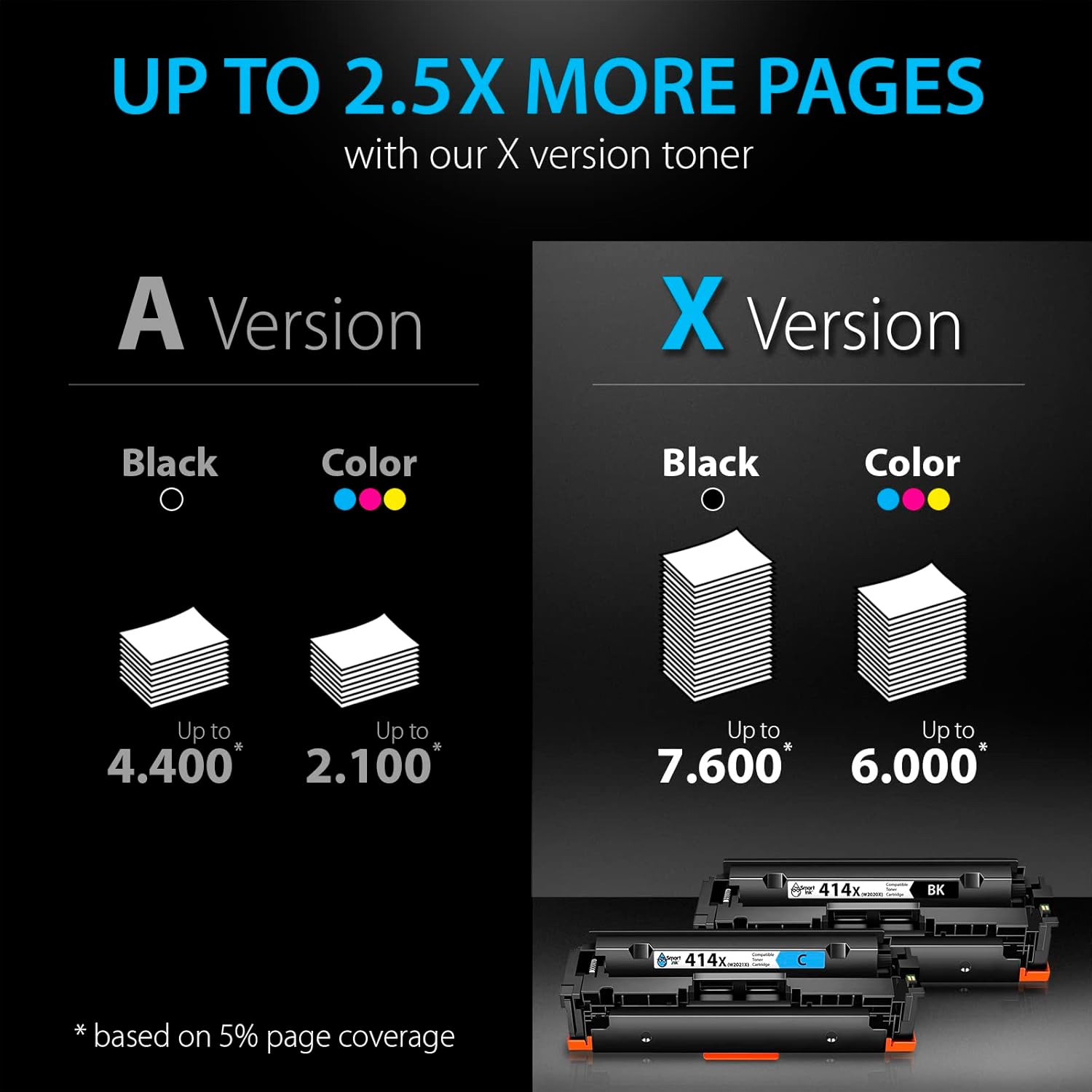 - Print More with replacement for HP 414 toner X Version: Up to 7,600 pages per 414X Black, 6,000 pages per X color cartridges (414X Cyan, 414X Magenta, 414X Yellow). Sharp and vibrant prints with Smart Ink cartridge replacement for HP 414X
