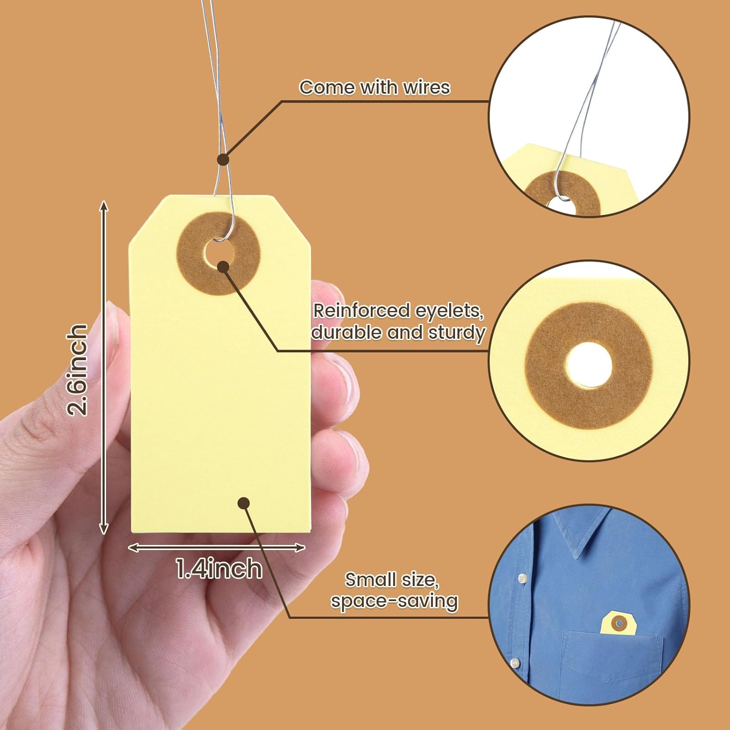 - Whatโs Included: 100PCS yellow small shipping tags and 100PCS metal wires, measuring 2.75"x1.37". These tags provide ample quantity for different purposes, improving organization and efficiency