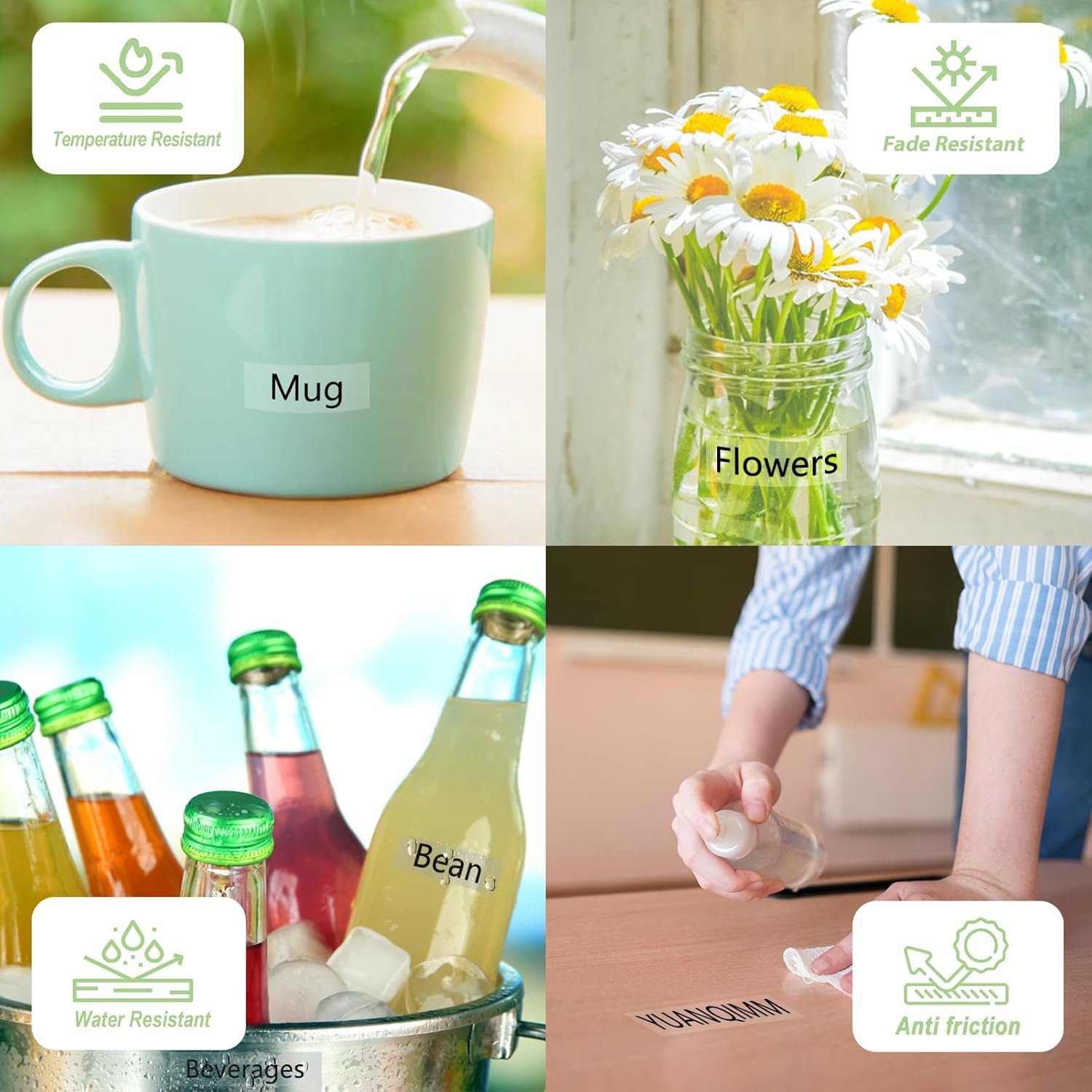 - Features: water resistant, fade resistant, temperature resistant, corrosion resistant, abrasion resistant, grease resistant, grime resistant and chemical resistant