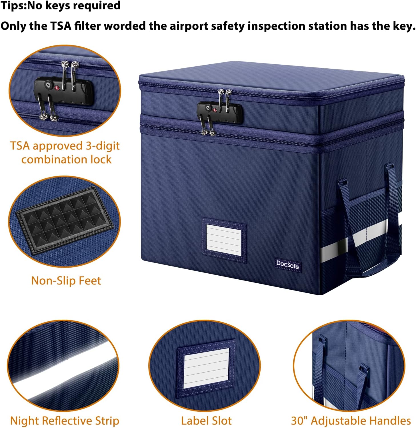 DocSafe File Box with Lock,Multi-Layer Fireproof Document Box Collapsible File Storage Organizer with Pockets/Handle,Large Portable Home Office Filing Safe for Hanging Letter/Legal Size Folders,Blue