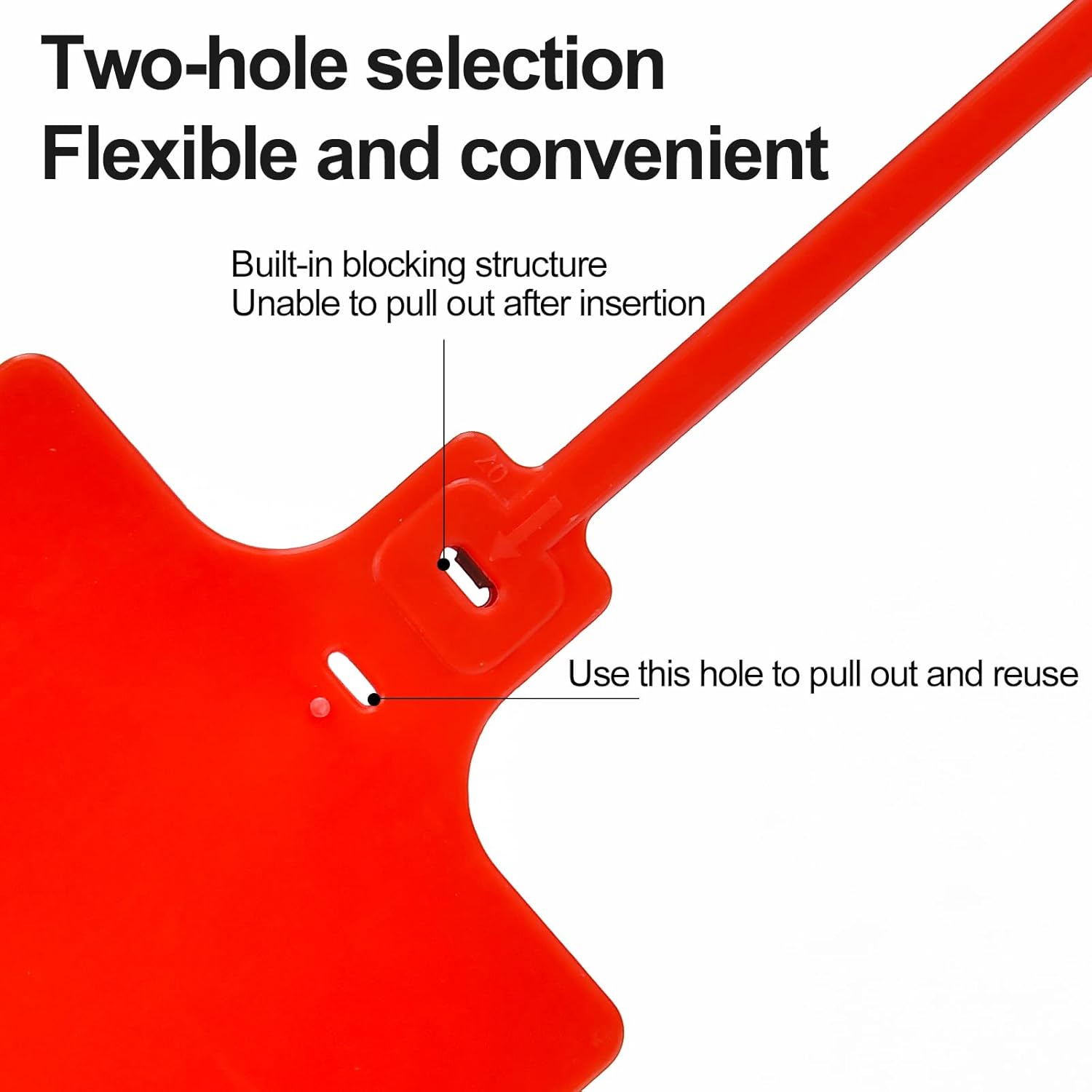- 【Double lock design】: The identification tags design with 2 holes, single-use hole and reuse hole. The single-use hole can be self-locking for a tamper proof security seal, it cannot be pulled out once locked. The reuse hole can be applied many times. You can use two holes plastic tags according to your needs.