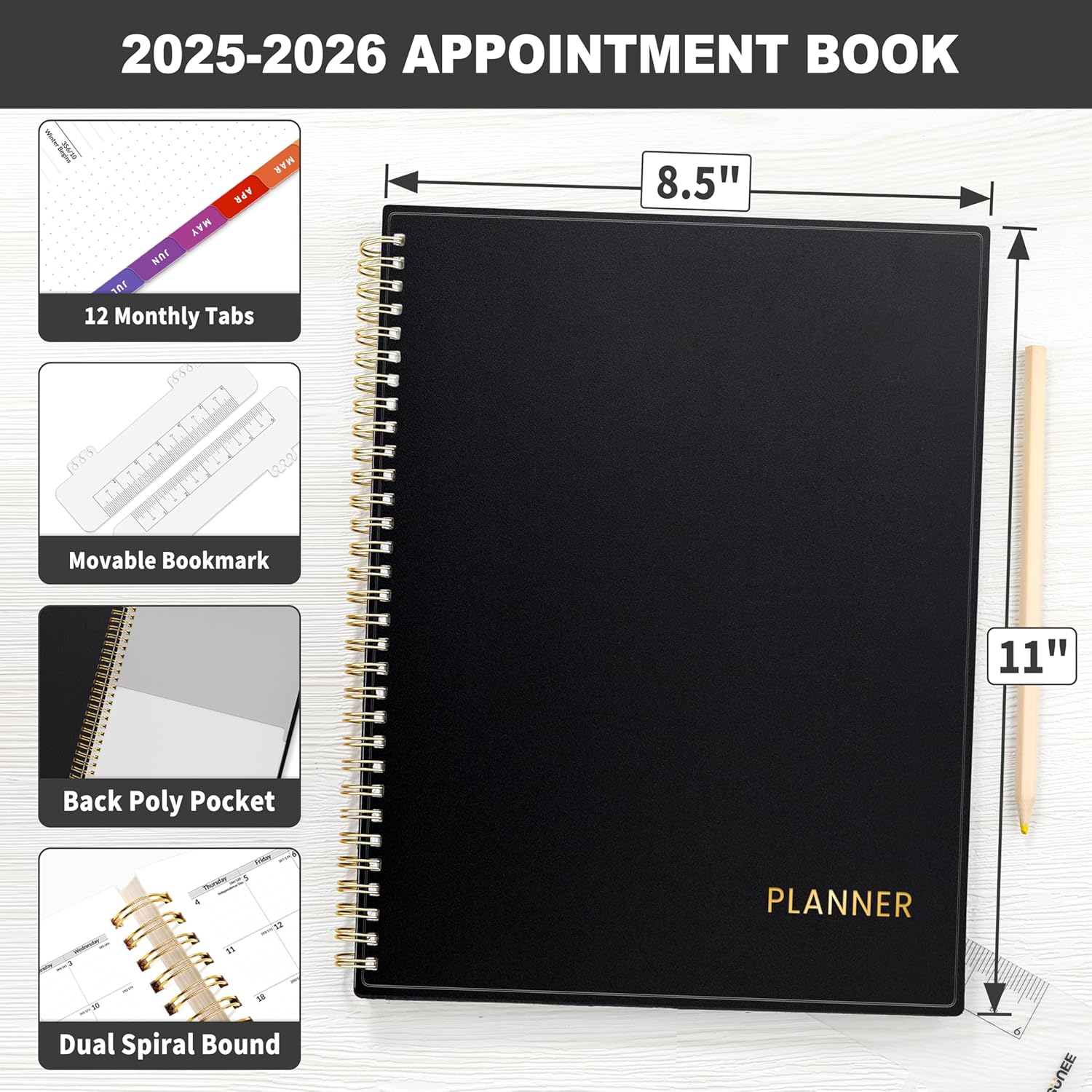 SUNEE 2025-2026 Appointment Book, Quarter-Hourly, Weekly & Monthly - from July 2025 to June 2026, 8.5"x11" Academic Planner, Flexible Cover, Note Pages, Bookmark, Spiral Binding, Black