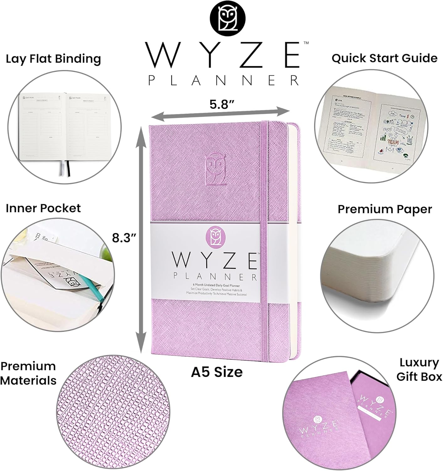 Undated Daily Planner – 6-Month A5 Productivity Organizer with Full Page Per Day, Hourly Schedule, Goal Setting, Habit Tracker, Weekly & Monthly Pages – Hardcover Time Management Notebook (Lilac)