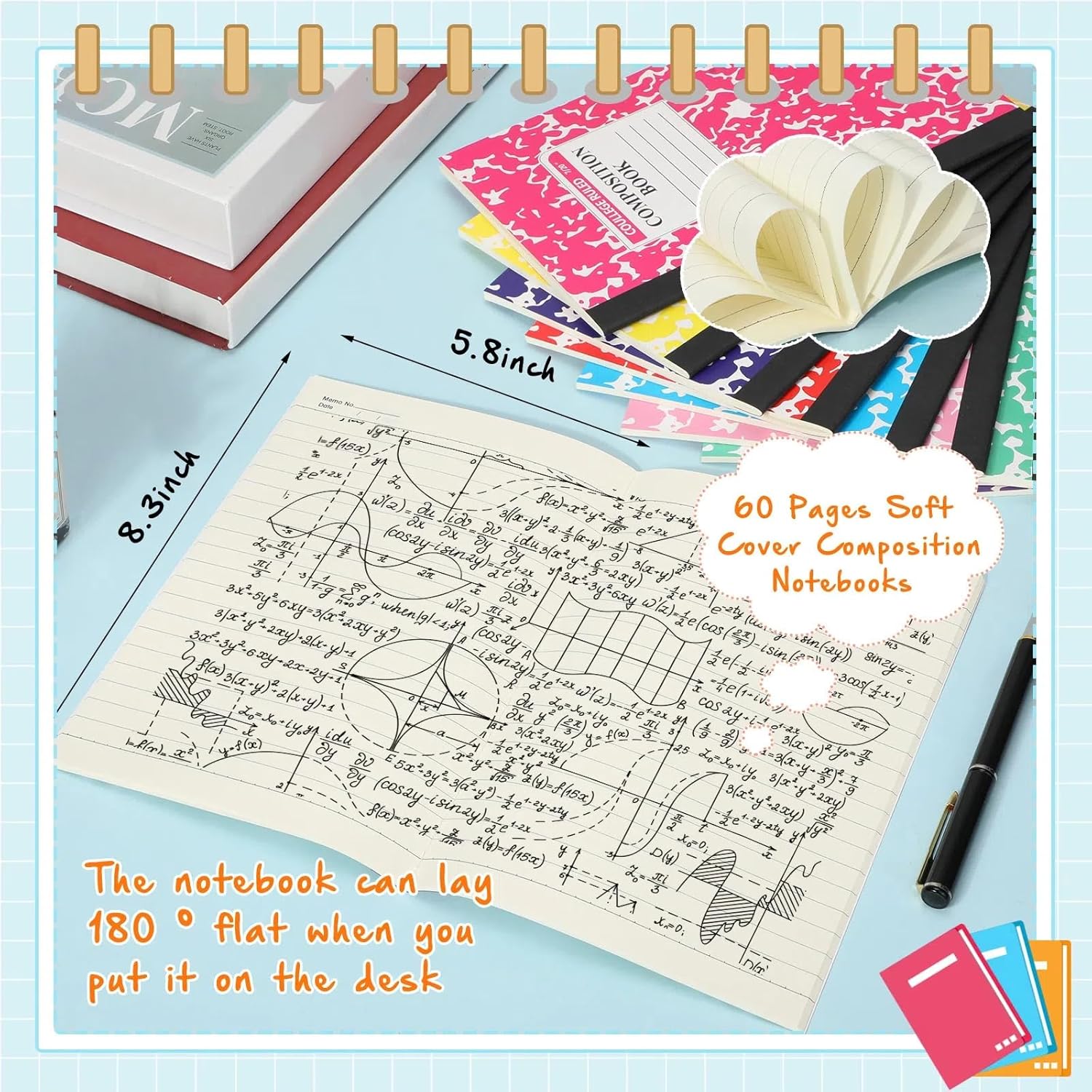 - Wide Ruled Sheets: each college ruled composition notebook contains A5 8.2 x 5.5 inch wide ruled sheets, notebook Include 60 pages to help you keep your notes organized, the quality paper of these marble composition notebook handles mechanical pencils, gel pens, ink pens and highlighters and won't bleed ink, so you will have a wonderful experience