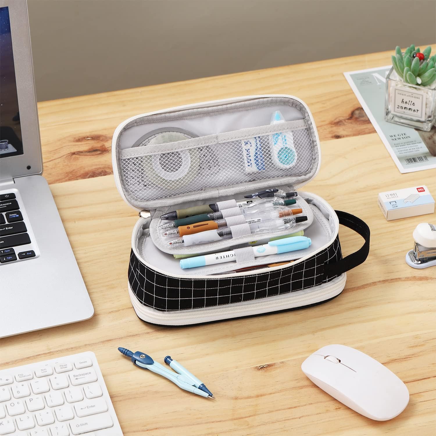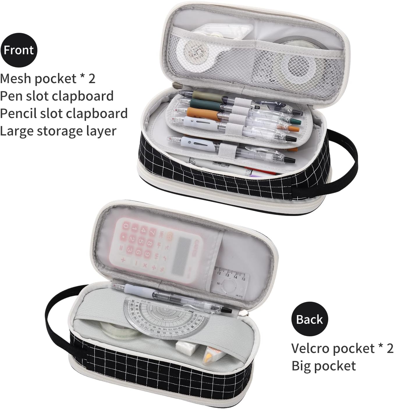 Large Pencil Case Zipper Pencil Pouch for Girls Boys Adults Kids Aesthetic Pencil Bag Organizer Big Capacity Pens Bag with Handle Portable for School Office Black-plaid