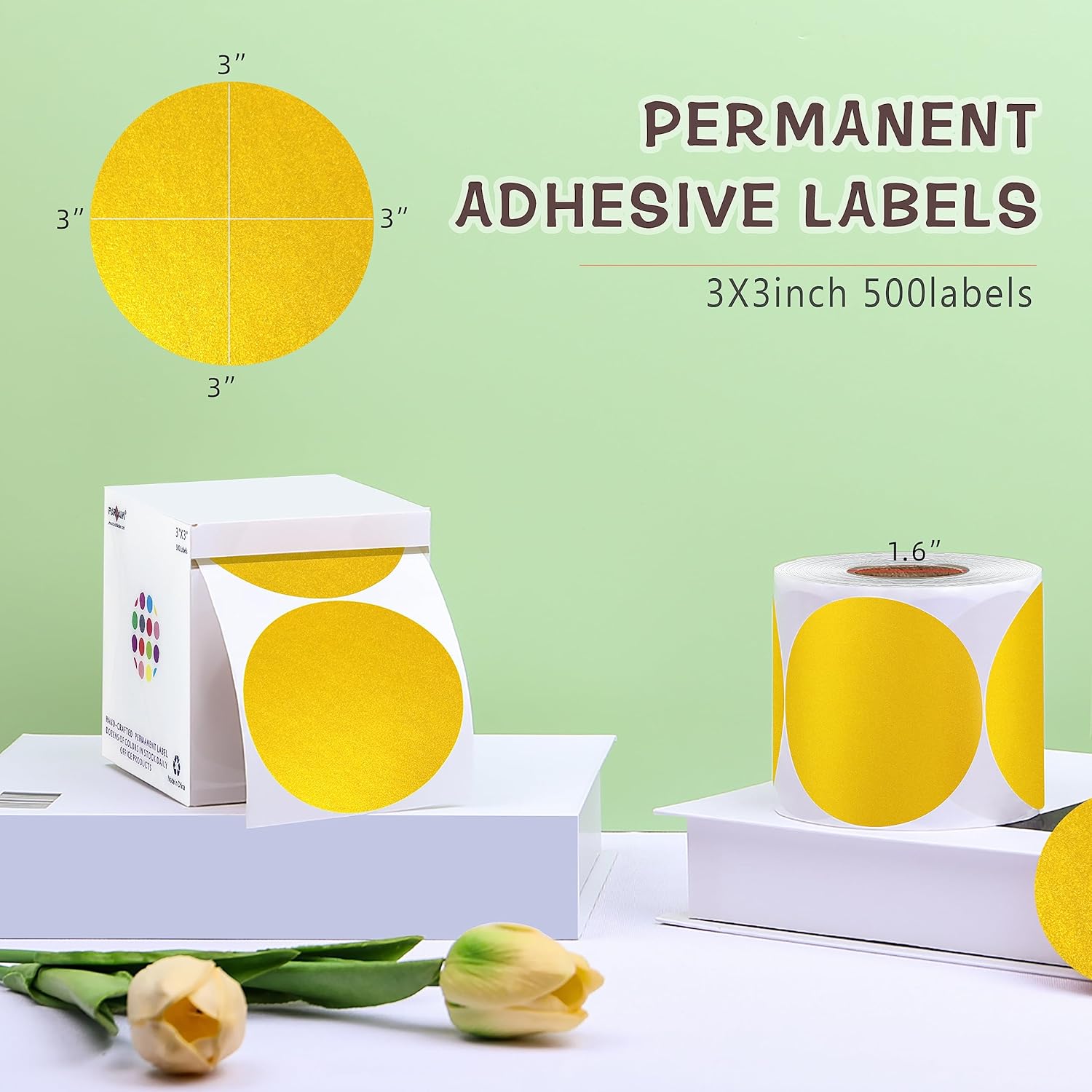 - 500pcs coding adhesive labels on a roll. 3” diameter, Gold Color-Code Dot Stickers.