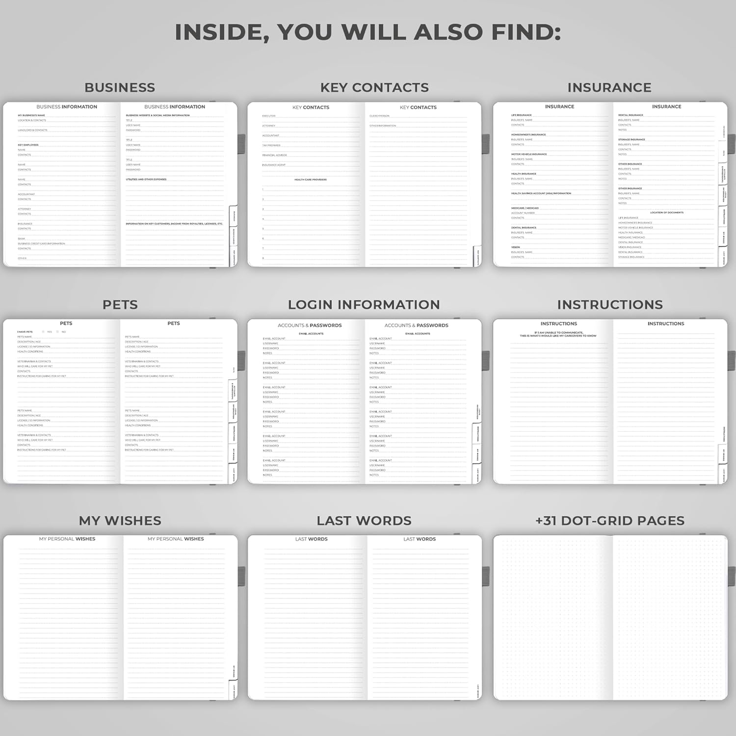 - PREPARE DETAILED INSTRUCTIONS TO GUIDE YOUR LOVED ONES: This guided final arrangements planner is an easy-to-use tool for organizing all essential personal information, from medical data to passwords and financial records.