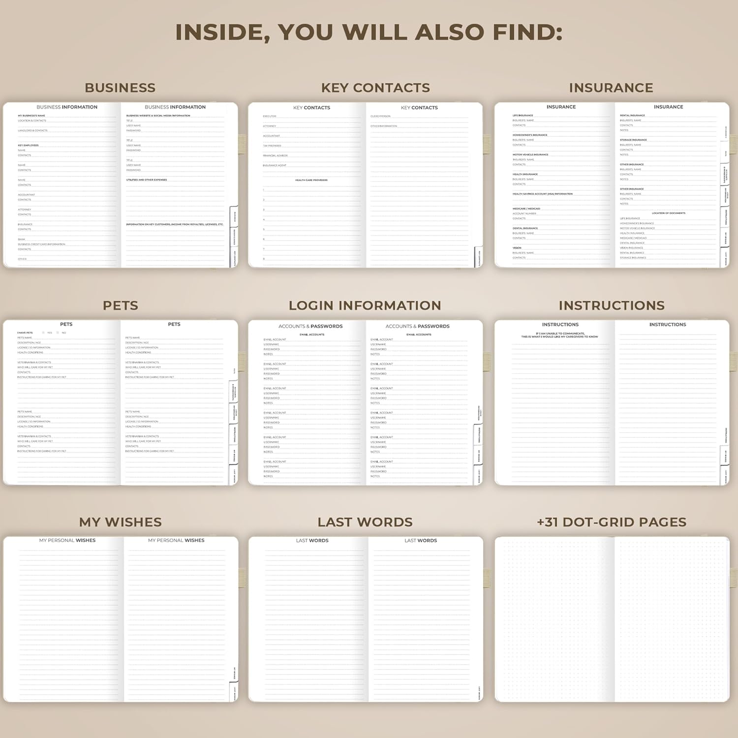 - PREPARE DETAILED INSTRUCTIONS TO GUIDE YOUR LOVED ONES: This guided final arrangements planner is an easy-to-use tool for organizing all essential personal information, from medical data to passwords and financial records.
