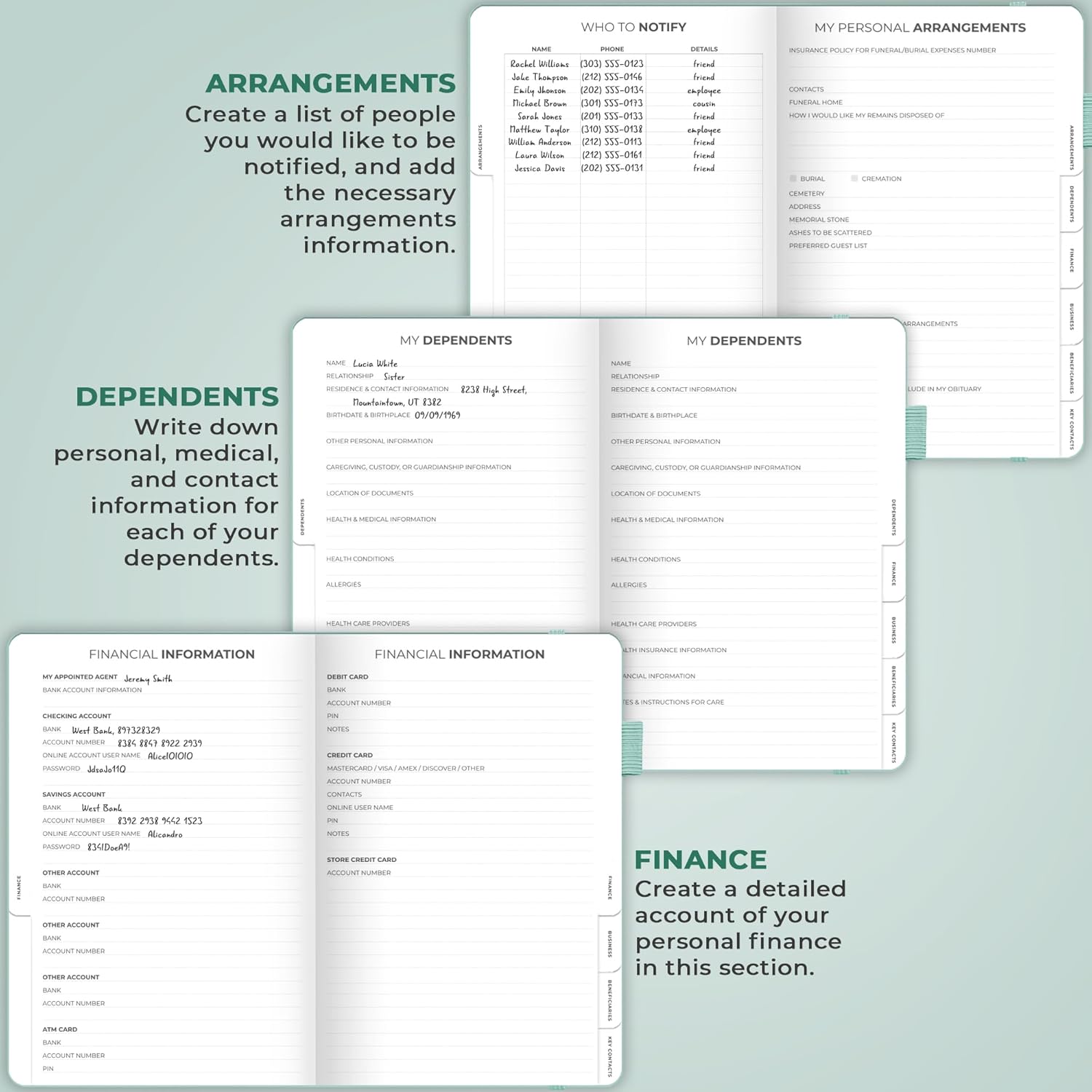 - MEDICAL & FINANCIAL INFO, INSURANCE POLICIES, ACTIVE MEMBERSHIPS & MORE: Inside this funeral planning workbook, you can add care instructions for dependents and pets, personal property, finance & business info, insurance policies, beneficiaries, and more.