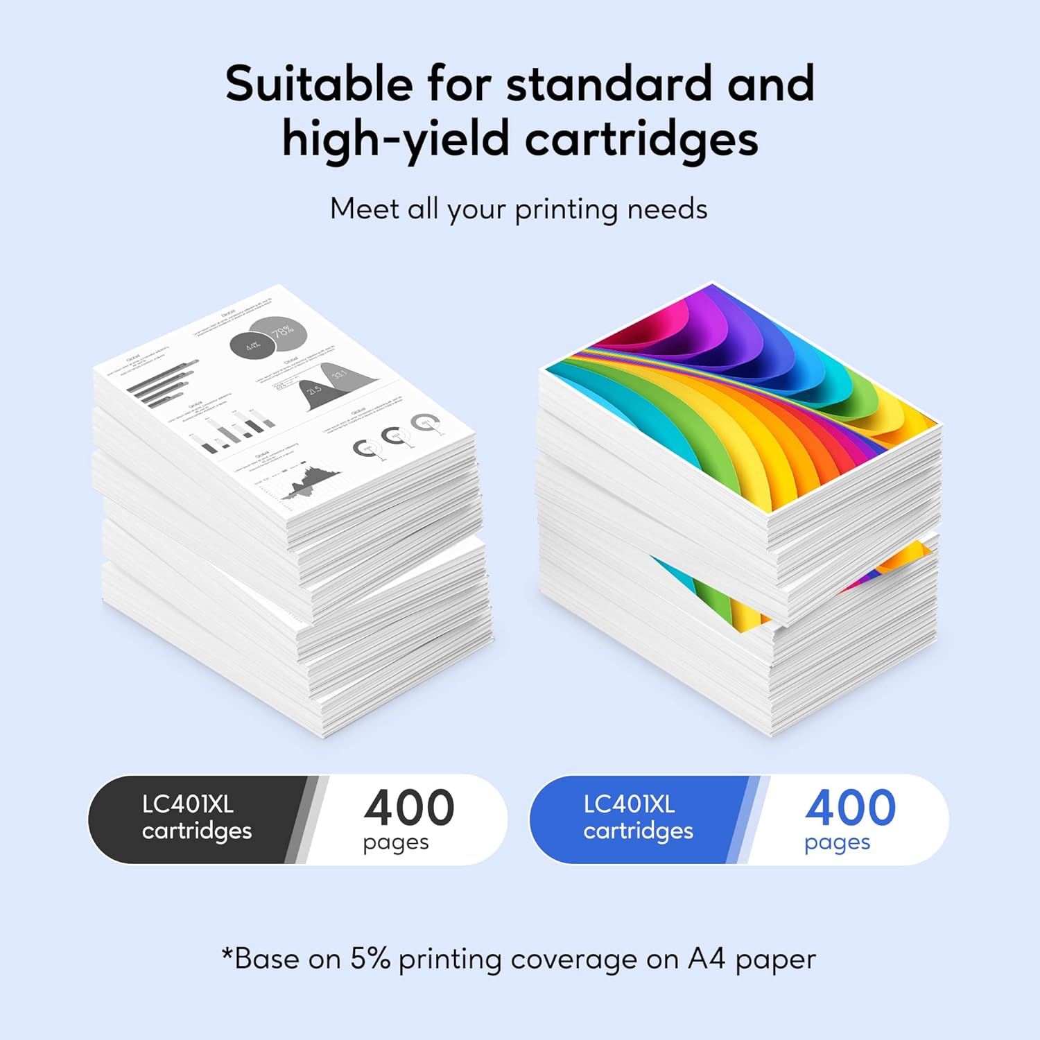 - Pages Yield: Up to 500 Pages per LC401 Black XL ink cartridge, 200 Pages per LC401XL Color ink cartridge.