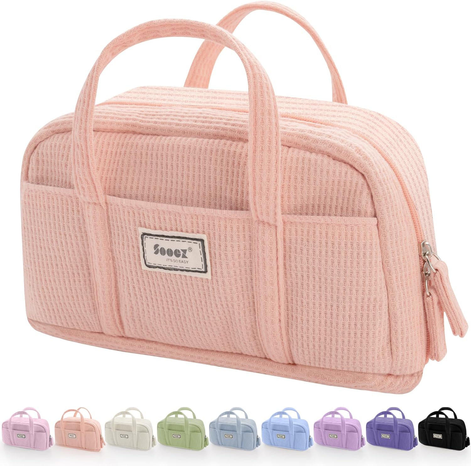 Sooez Large Pencil Case Pouch, Extra Big Pencil Bag with 5 Compartments, Pen Bag Wide Opening, Soft Waffle Pencil Pouch Organizer with Zipper, Cute Aesthetic School Supplies for Teen Girls-Coral