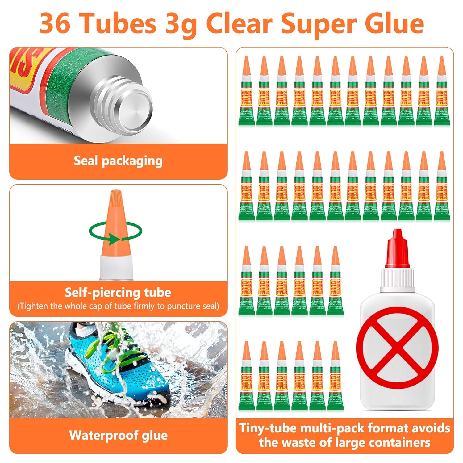 36 x 3g Super Strong Glue for All Purpose, Clear Cyanoacrylate Adhesive Instant Quick Dry Superglue Gel Tubes Bonding Plastic, Metal, Glass, Leather, Wood, Rubber, Jewelry, DIY Crafts Repair