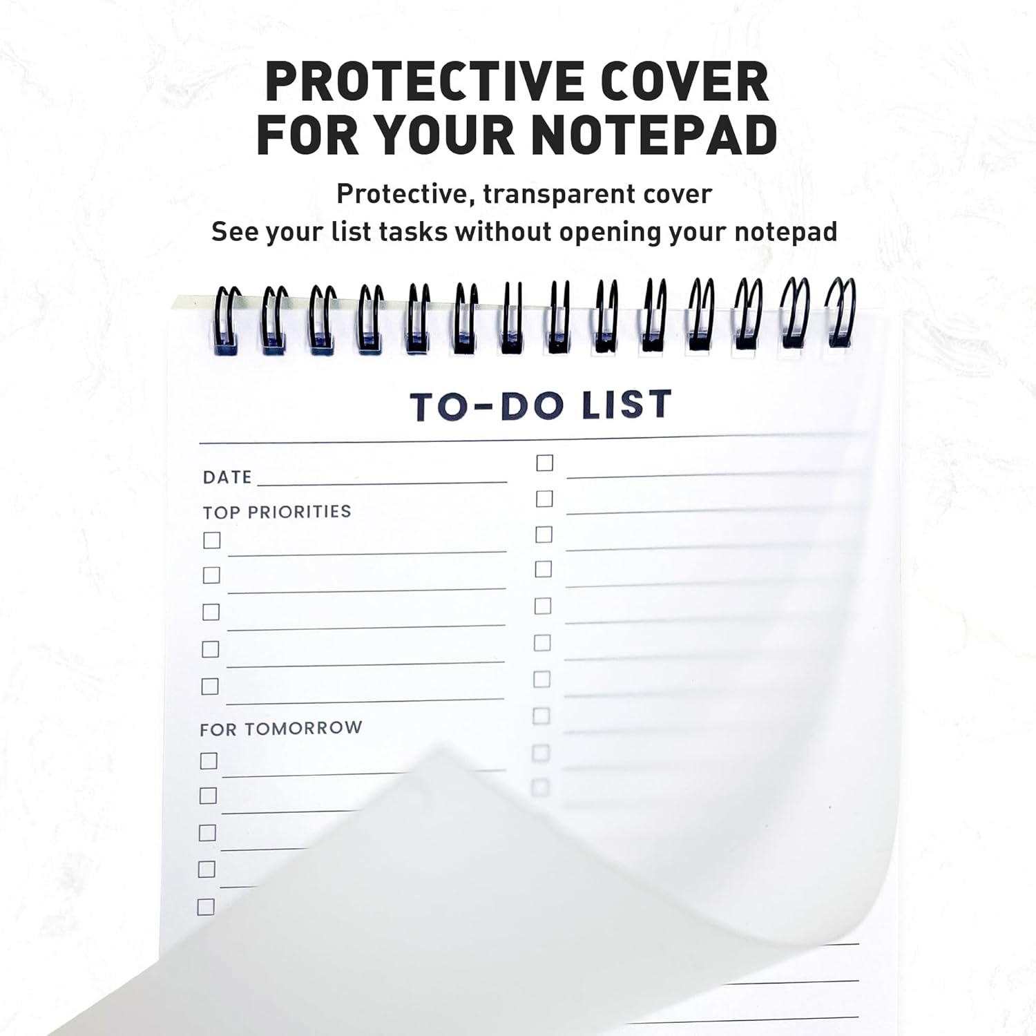 - Spiral Bound with Protective Cover: Our twin spiral-bound notepad lets you start a new page while keeping old ones for reference. It makes it easy to flip through your to-do list. Want to remove your lists when you’re done? No problem! They can be torn out as needed. When you're on the go, the plastic cover on our notepad protects the pages from spills, scratches, and tears. Even better, the cover is see-through so you can quickly glance at your to-do list page as you go about your day.