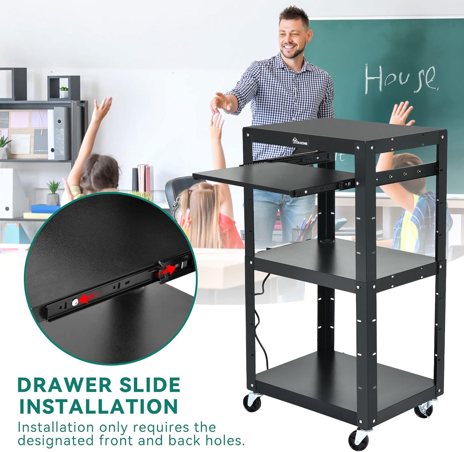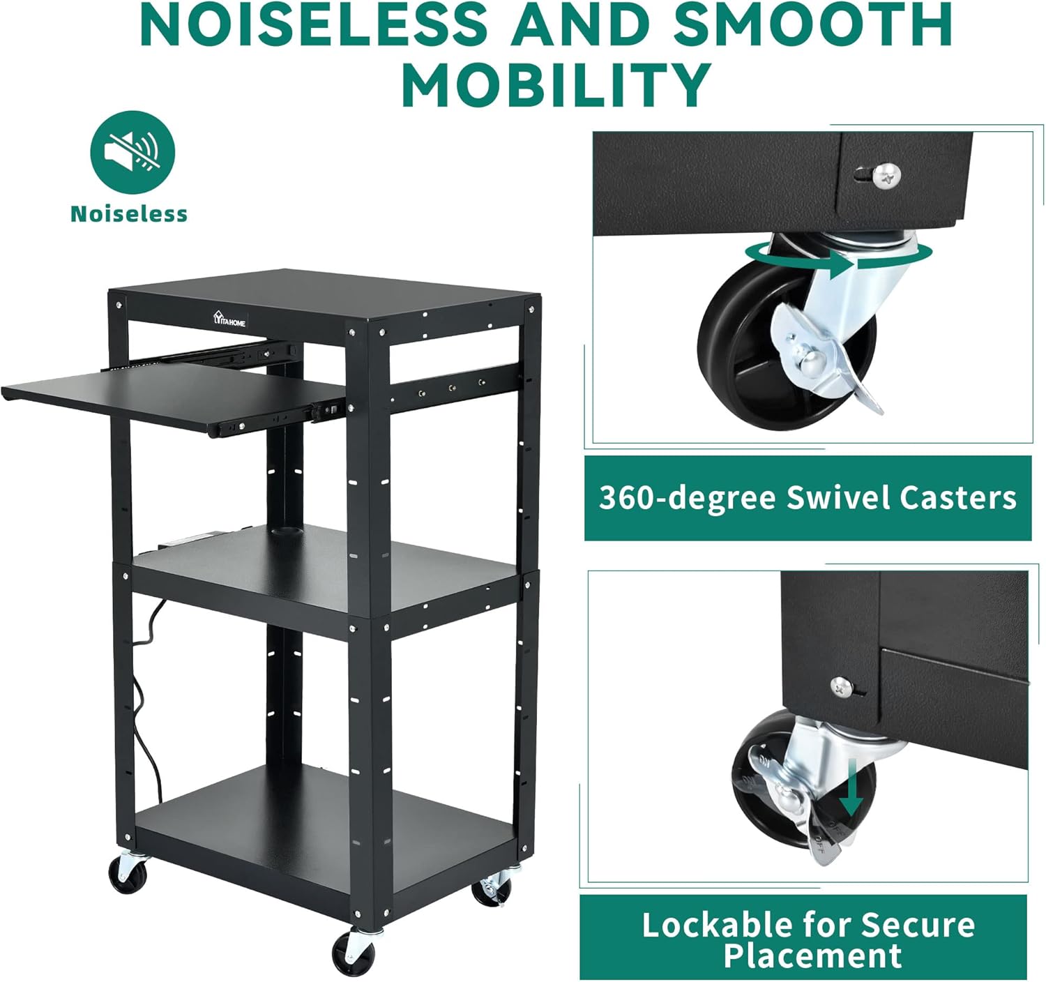 YITAHOME Large AV Cart with 16.4ft Extra-Long Cord, Metal Presentation Cart with Keyboard Tray, Rolling Media Carts with Wheels and Power, 2 Locking Brakes, Easy to Assemble, Black