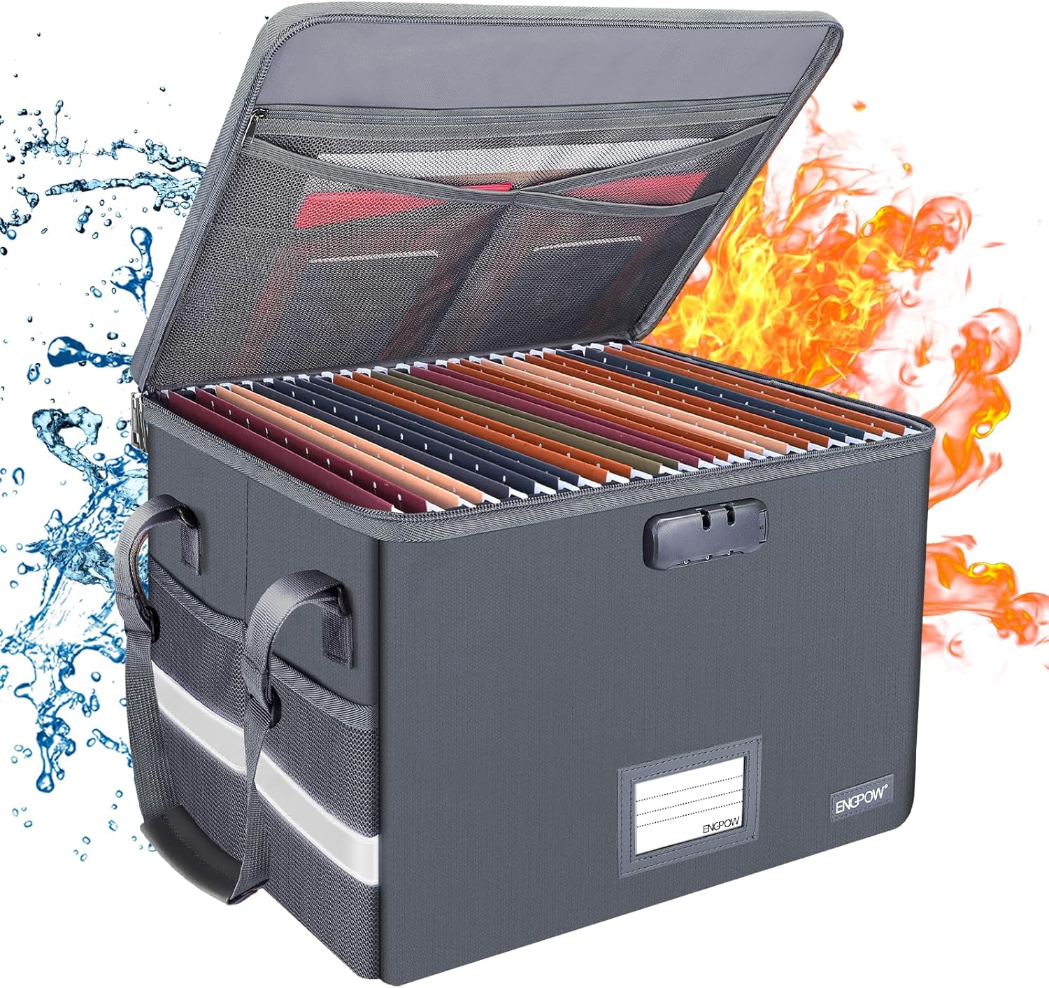 ENGPOW File Box with Lock, Fireproof Document Box with Zipper Lid, Collapsible File Organizer Storage Filing Cabinet with Handle, Portable Home Office Safe for Hanging Letter/Legal Folders, Grey
