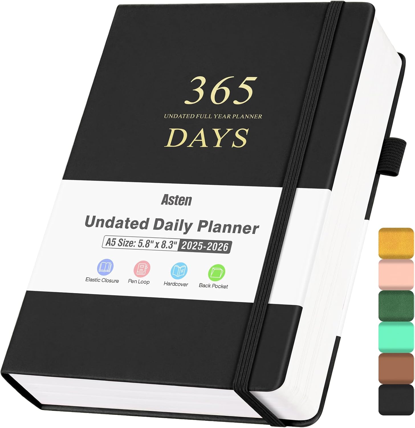 Daily Planner Undated, Planner 2024-2025, 365 Day Planne, Work Planner for Men, Hourly Planner Notebook for Goal Setting, Appointment Planner, Hardcover, Start Anytime, A5, Black