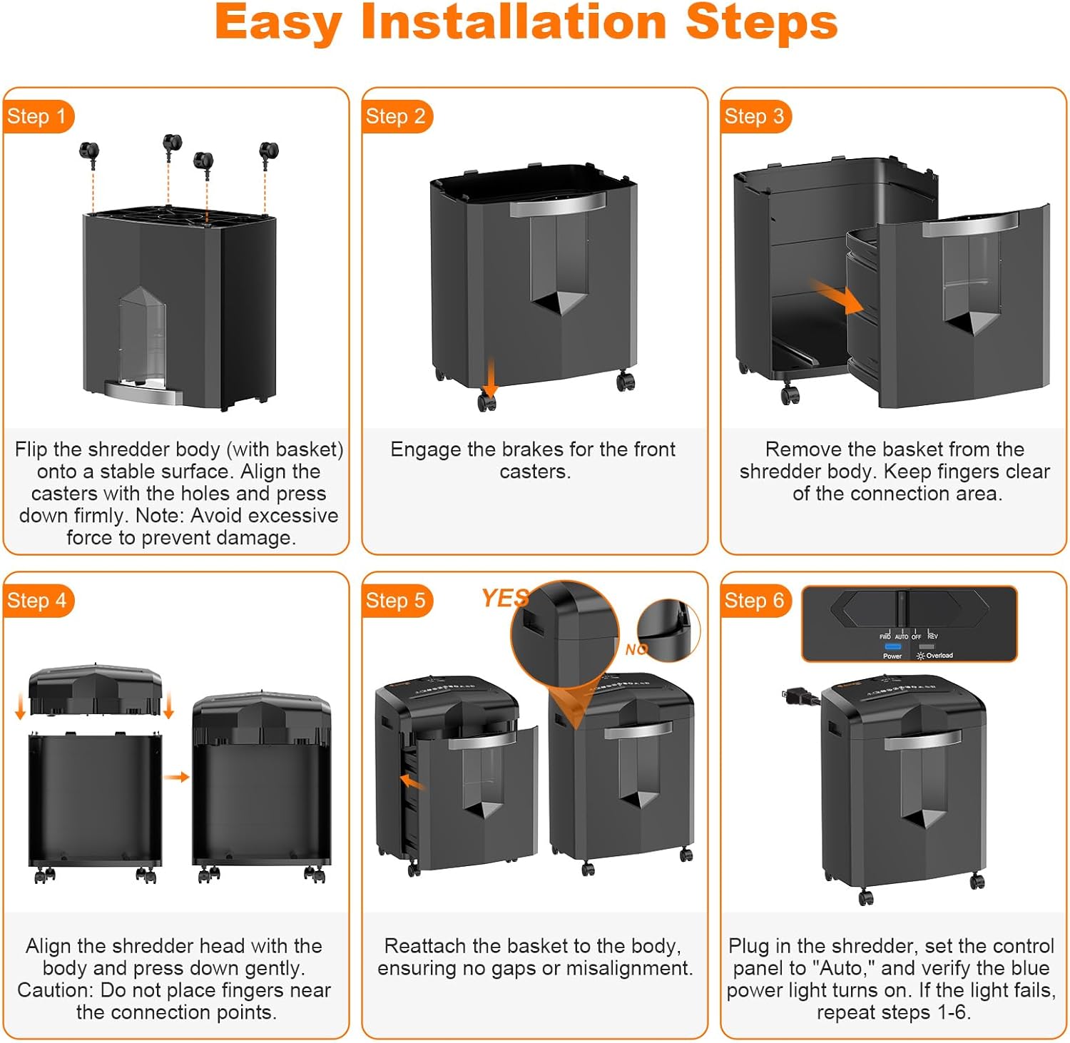 - Step 1: Flip the shredder body (with basket) onto a stable surface. Align the casters with the holes and press down firmly. Note: Avoid excessive force to prevent damage. Step 2: Engage the brakes for the front casters. Step 3: Remove the basket from the shredder body. Keep fingers clear of the connection area. Step 4: Align the shredder head with the body and press down gently. Caution: Do not place fingers near the connection points. Step 5: Reattach the basket to the body, ensuring no gaps or misalignment. Step 6: Plug in the shredder, set the control panel to "Auto," and verify the blue power light turns on. If the light fails, repeat steps 1–6.
