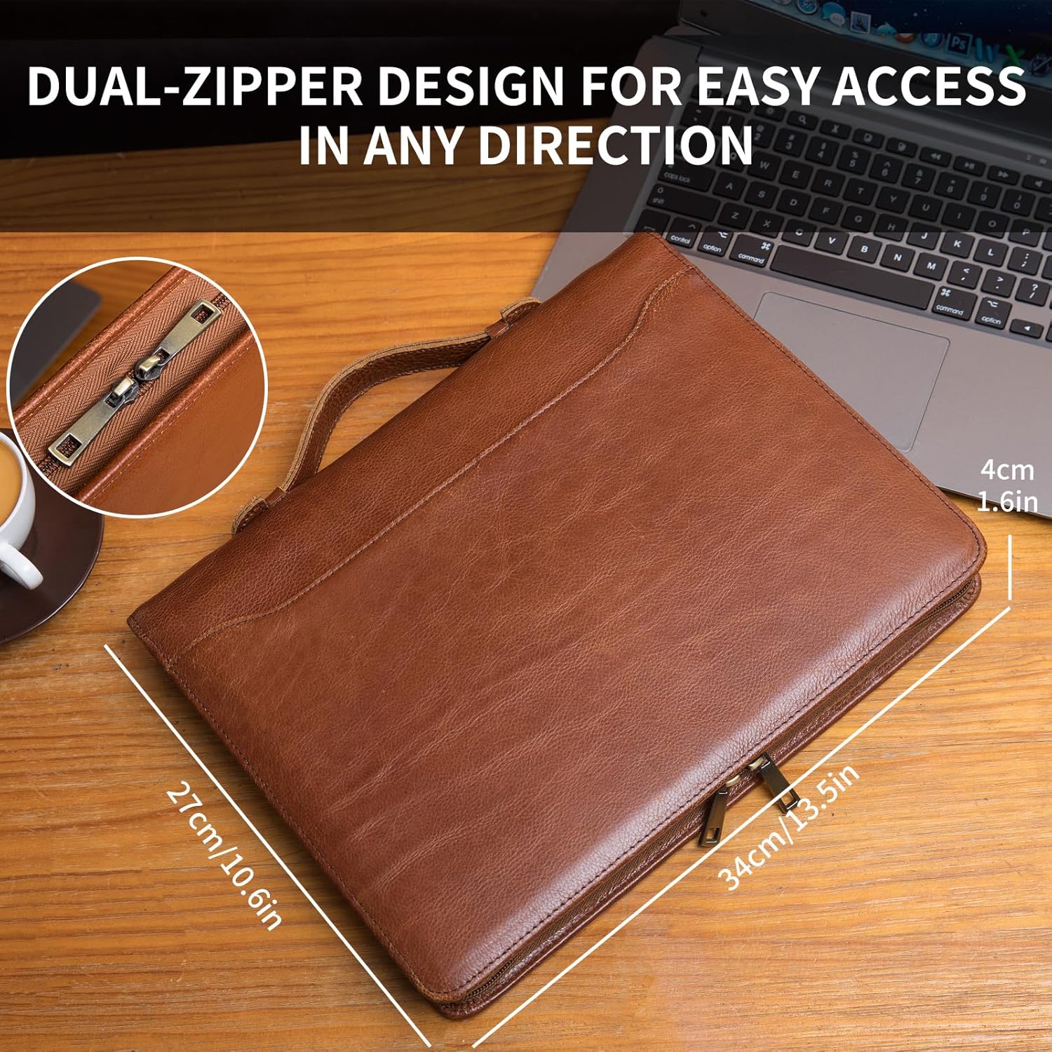 Genuine Leather Portfolio with Hidden Handle, Front Pocket, Business Padfolio Tablet/13” Laptop Organizer, Folio Document Cell Phone Holder, Professional Executive Folder, Brown, Oil Tanned