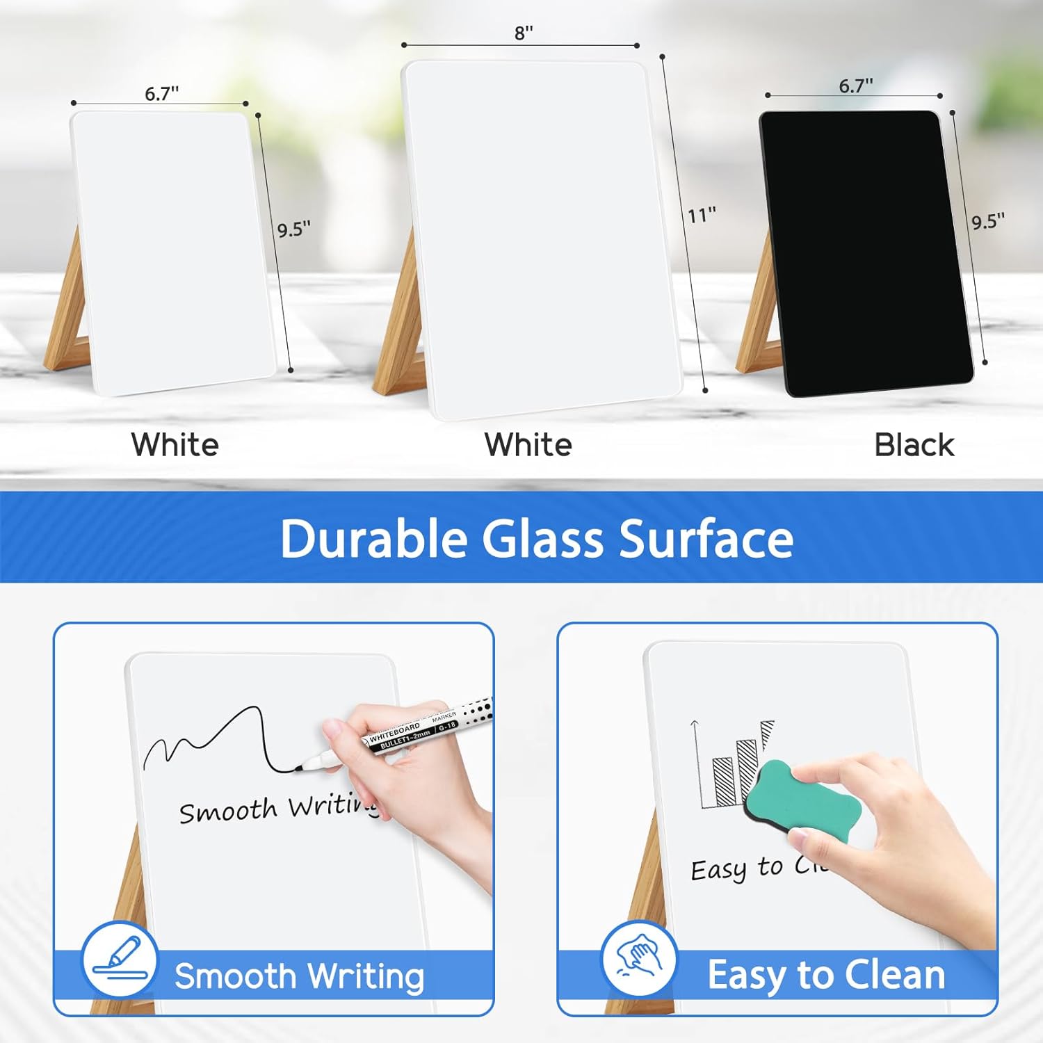 - ✨【Smart & Portable】WALGLASS Desk White Board is compact and portable. The reversible wood stand offers the flexibility of a flat writing surface or a stand up on for easy viewing, adapting effortlessly to your needs. With its compact and portable size, this desk whiteboard is easy to carry and helps conserve usable desktop space.