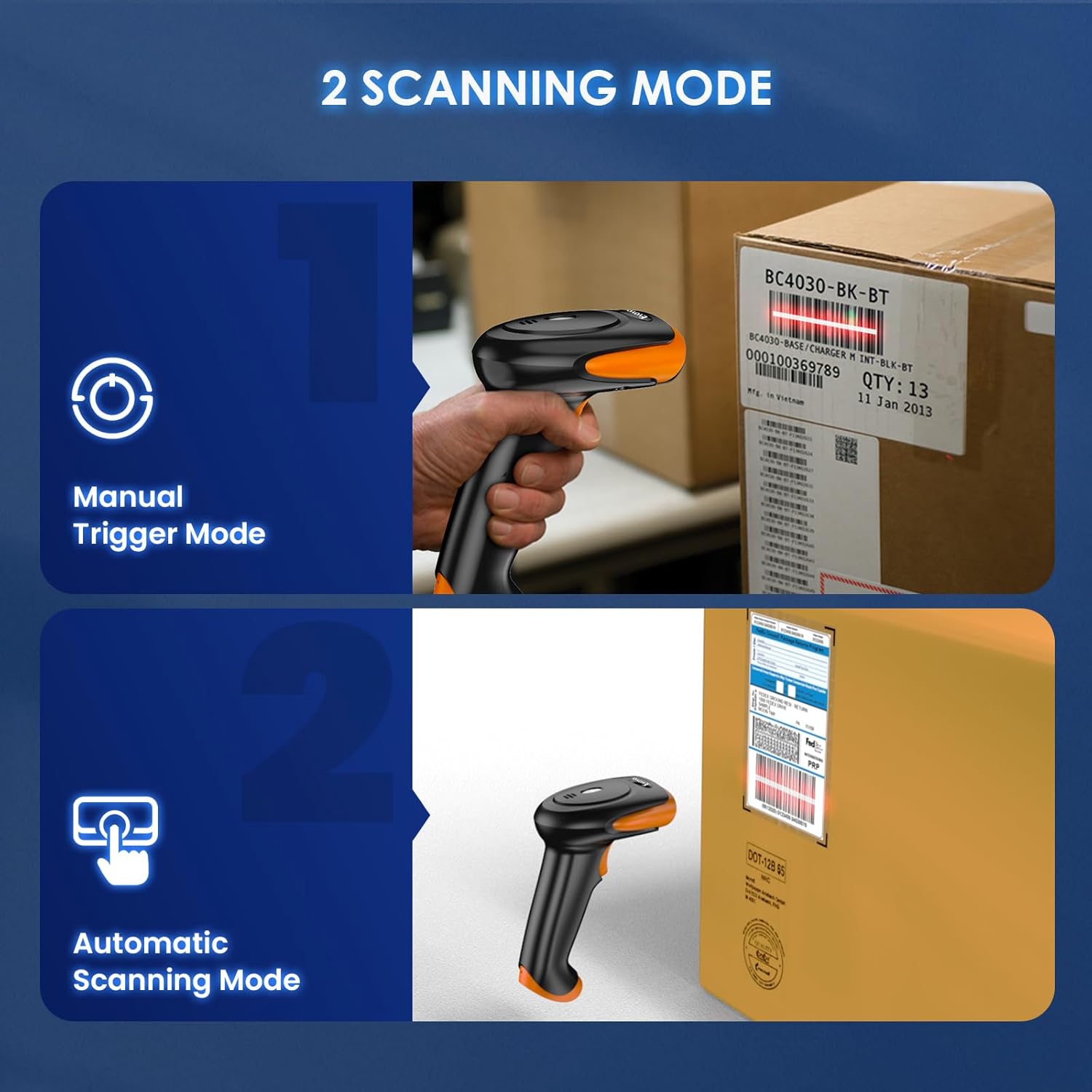 - Automatic Scanning & Storage Mode: Automatic scanning mode can be set for your needs. Automatic sensor scanning without pressing a button. When the scanner exceeds the connection distance, you can select the storage mode. In storage mode, up to 40,000 barcodes can be stored and uploaded directly when you return to within a connecting distance