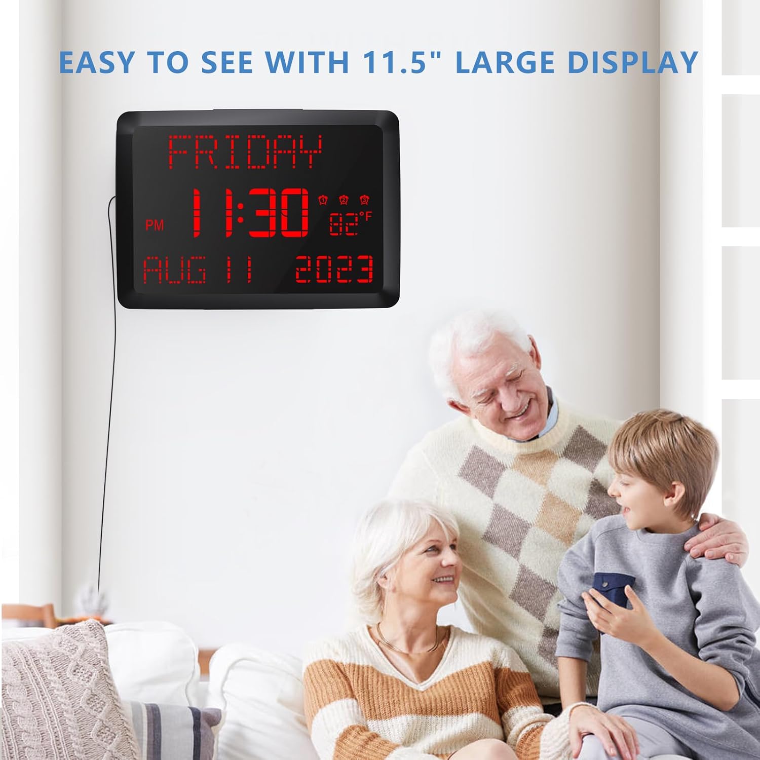Raynic Digital Clock, 11.5" Large Display Digital Calendar Clock with Day and Date, Indoor Temperature, Adjustable Brightness, Snooze,12/24H, DST for Home, Office, Elderly