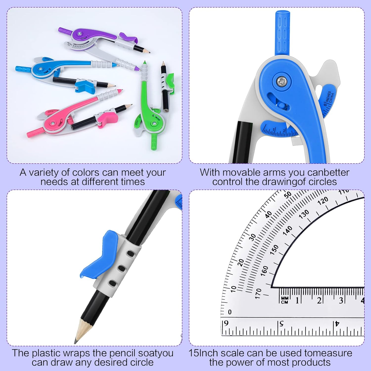 - What You Get: the package includes 36 sets of geometry kits, including 36 pieces of protractors and 36 pieces of compasses with 36 pieces of pencils, there are 4 different colors of compasses, green, pink, purple and blue, allowing you to choose as you like