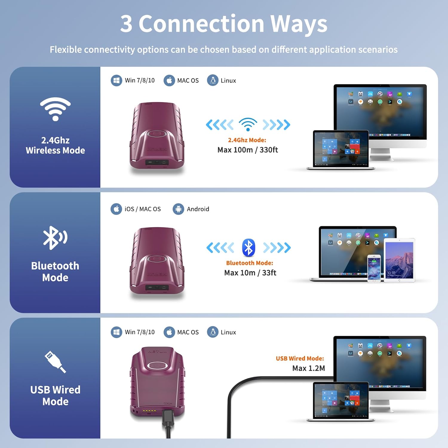 - 1200mAh Rechargeable Battery - This Bluetooth barcode scanner is equipped a 1200mAh rechargeable battery, it can be used for more than 8 hours continuous scanning after a full charge. You don't worry about the battery power, it can support your work all day. Developer Support Available