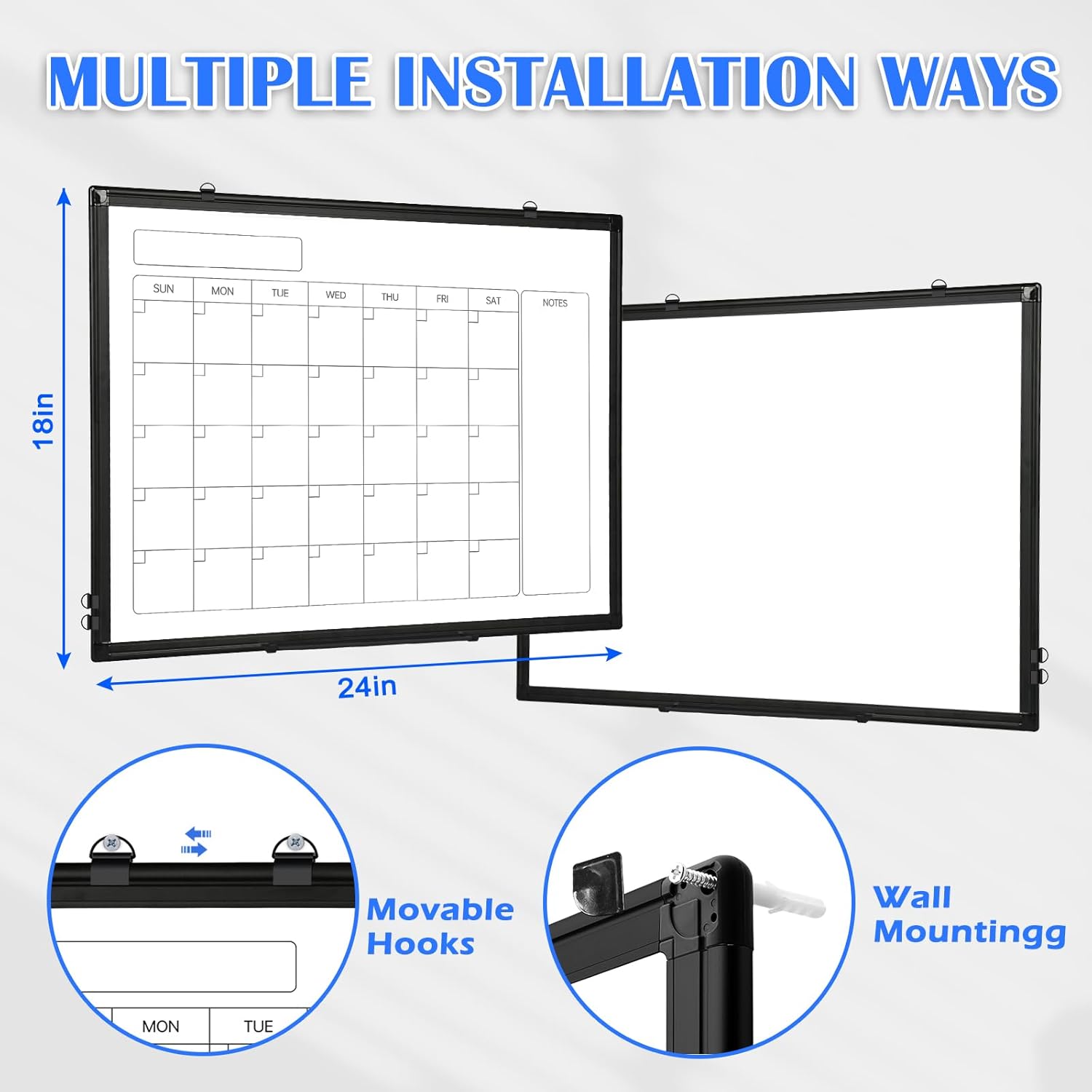 - 【Super Value Pack of Whiteboard】The 24 X 18 inches double-sided dry erase board set comes with 4 magnetic dry erase markers (include 4 color), 6 magnets, 1 movable tray, 1 dry eraser. The movable hanging hooks allow you to adjust the hanging distance easily.