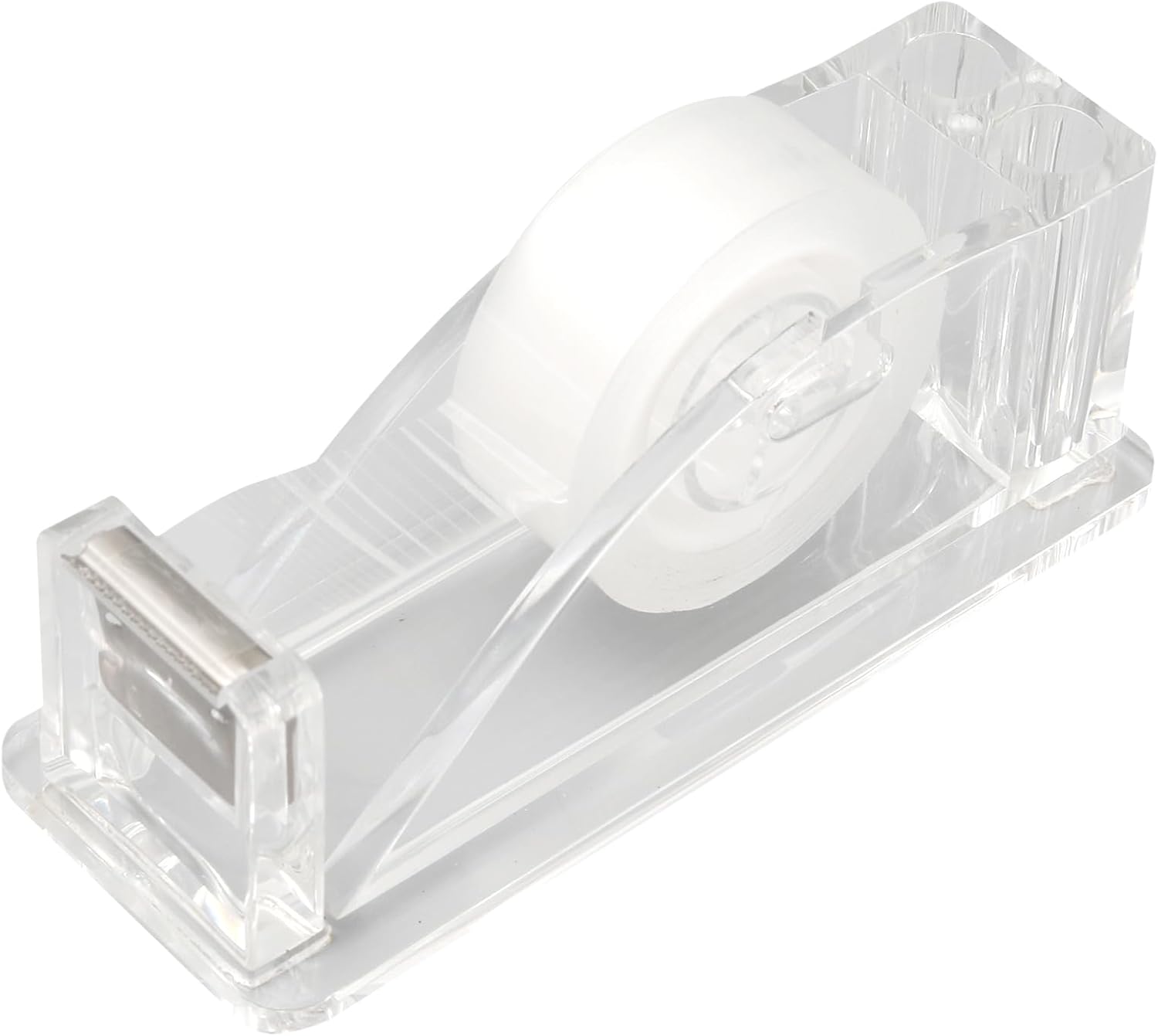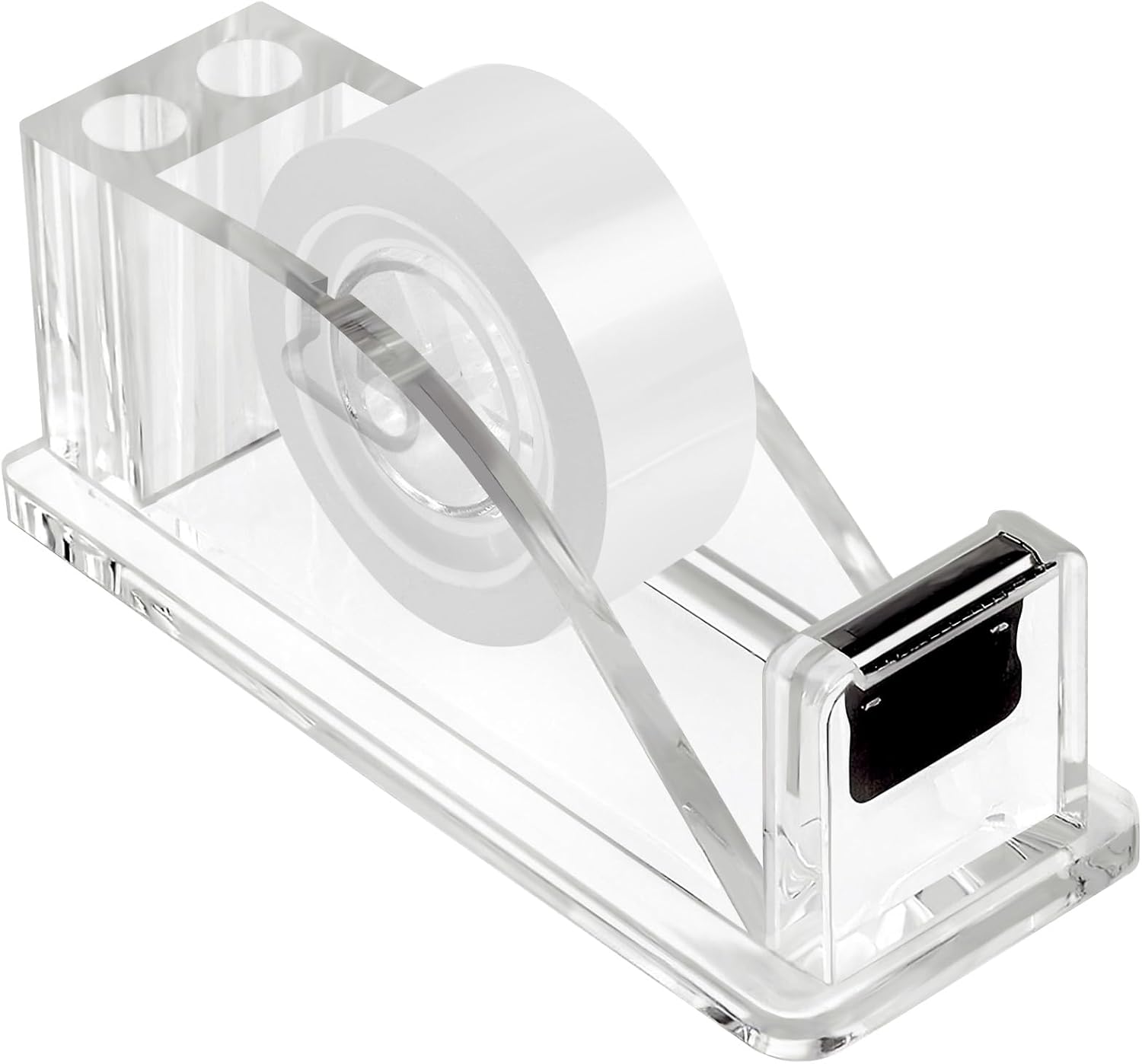 - Sleek and Modern Design: This tape dispenser features a contemporary design, combining ultra-clear acrylic with Pen container. It adds a stylish and modern touch to any office or desktop