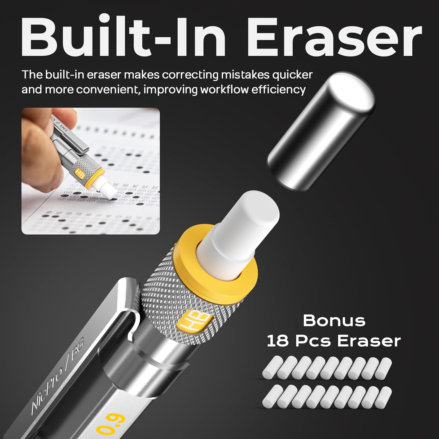 - Nicpro Blocky Gear:Come with 3pcs metal 0.9 mm mechanical pencil and 8 tube of 0.9 mm lead refills(HB,2B) ,40pcs / tube,3pcs 4B latex-free eraser,18pcs replaceable cap erasers,all the stuff storage neatly in a case with flocking tray,what a gift for friends & family!