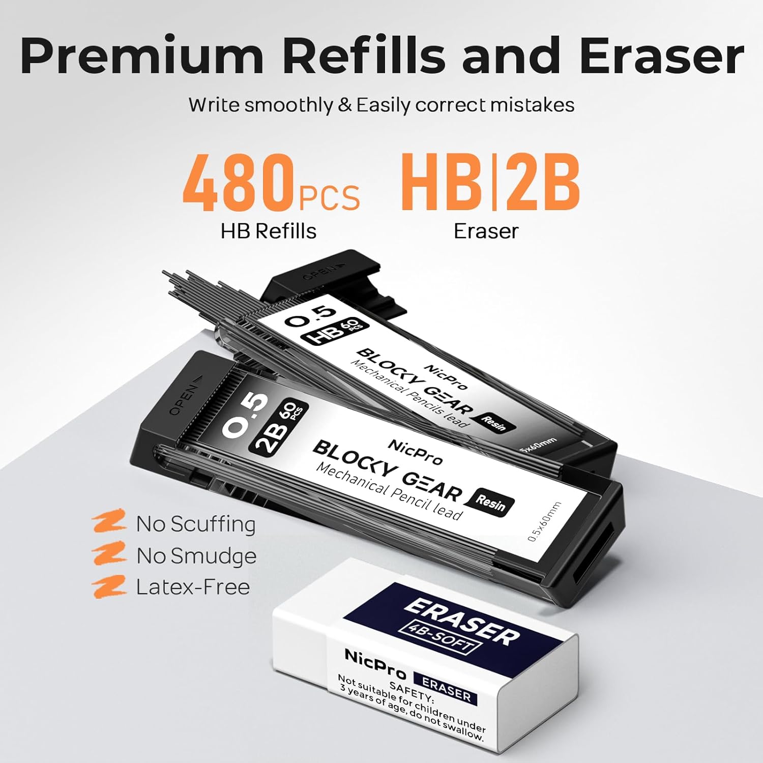 - Nicpro Blocky Gear:Come with 3PCS metal 0.5mm mechanical pencil and 8 tube of 0.5 mm lead refills (6 tube of HB and 2 tube of 2B), 60pcs / tube, 3pcs 4B latex-free eraser, 18pcs replaceable cap erasers,1 pcs kneaded eraser, all the stuff storage neatly in a case with flocking tray,what a gift for friends & family!Ideals for artists, professionals, teachers and students alike