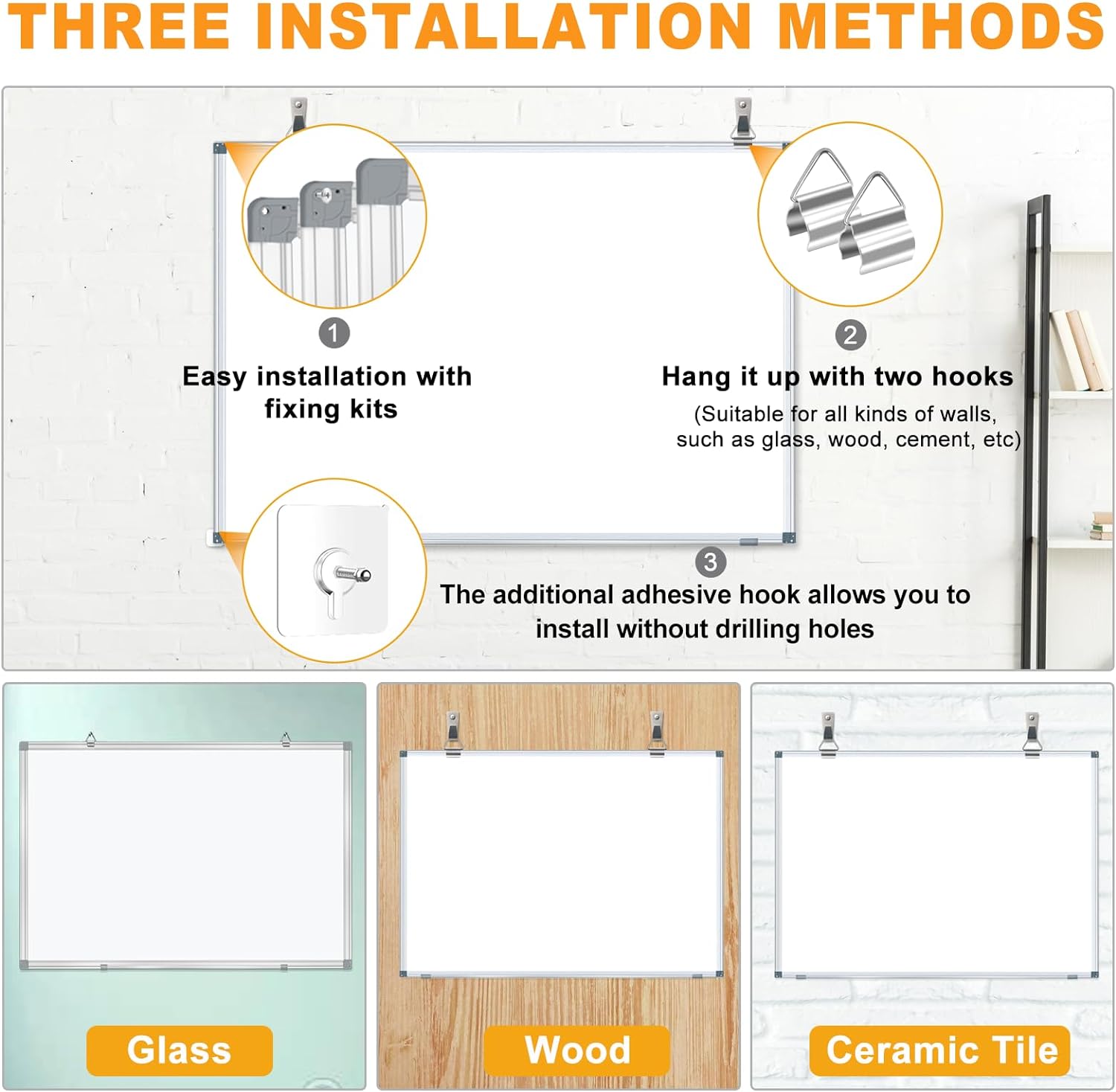 - Easy installation: Wall-mounted dry erase board can be mounted vertically or horizontally, concealed installation-Kits offered in the box, NEVER worried about drop-down. Alternatively, you can use two hooks to hang it on the wall.