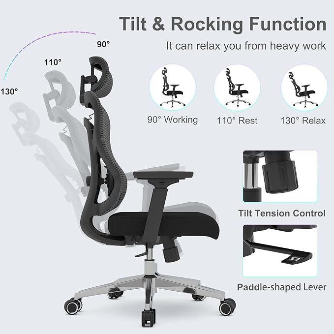 - 【Waterfall Chair Cushion】- Ergonomic office chair with comfortable rounded corner cushion, adjustable in height. And provides dynamic pressure distribution, which can improve blood circulation and reduce lumbar pressure. The comfortable office chair also has three levels of backrest adjustment from 90° to 130°, suitable for various working postures.