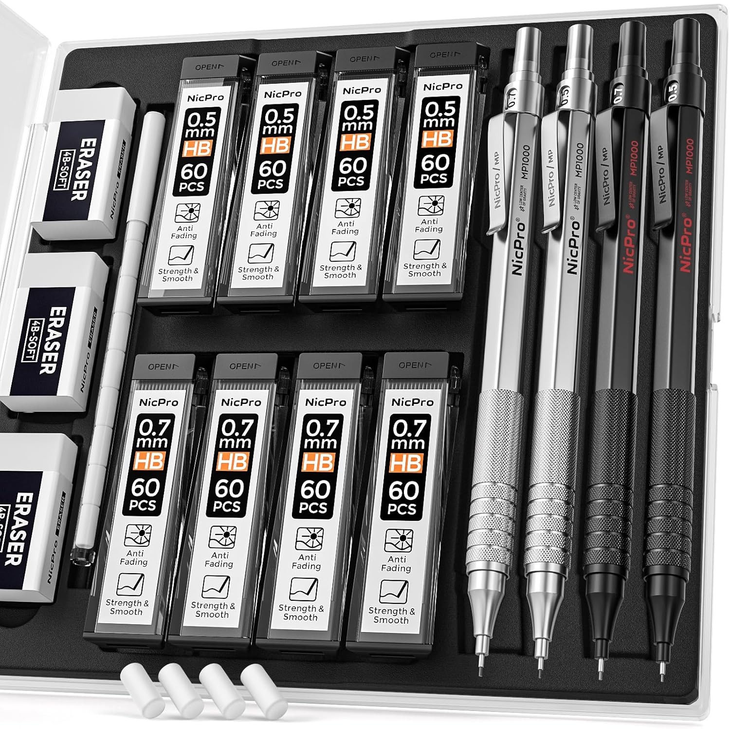 - Come with 4pcs different size 0.5mm & 0.7mm mechanical pencil(2pcs black, 2pcs silver) 0.7mm silver mechanical pencil, with 6 tube of HB #2 pencil lead, 2 tube of 2B pencil lead, 3pcs 4B-soft erasers, 9pcs Eraser Refills in a storage case. 480pcs lead refills total.