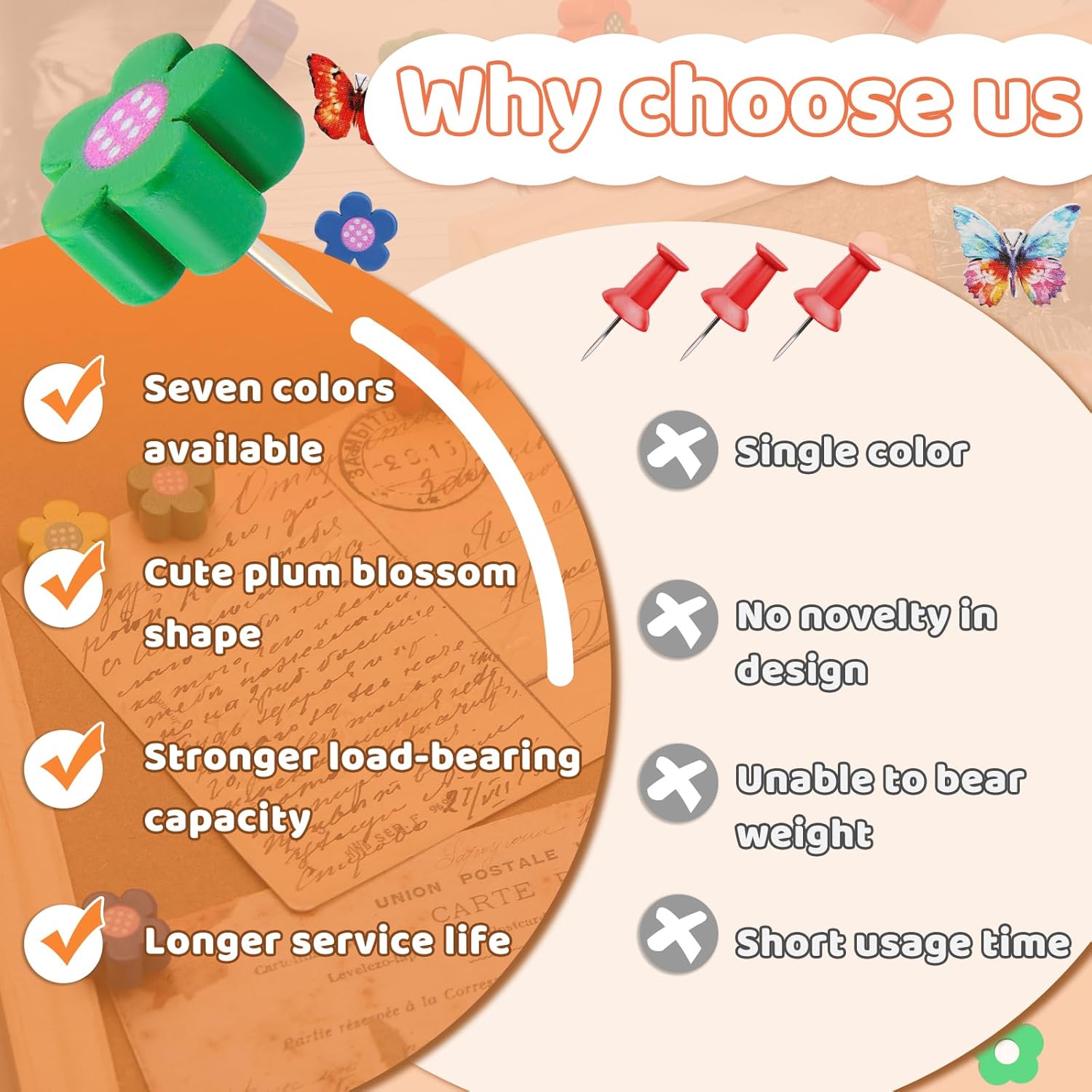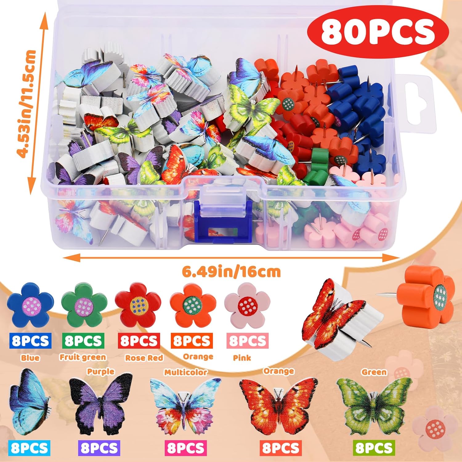 - What You Get: The package includes 40pcs flower shaped wooden thumb tacks and 40pcs butterfly shaped push pins, enough to fix various objects, and comes with a white box, which is convenient for you to carry and prevent them from being lost.