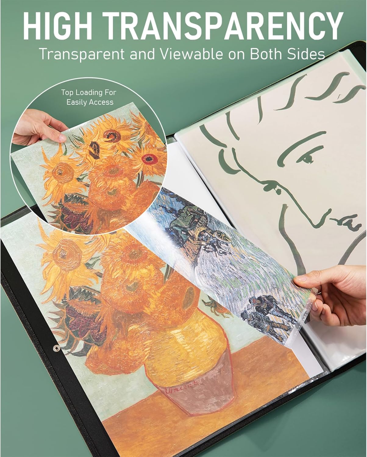 - Black Inner Sheets: The art portfolio case comes with black inner sheet for each sleeves, which can make a great vision if your picture or painting smaller than the transparent sleeves. Not only make your doc non-wrinkle but also easily to remove or insert files without barriers