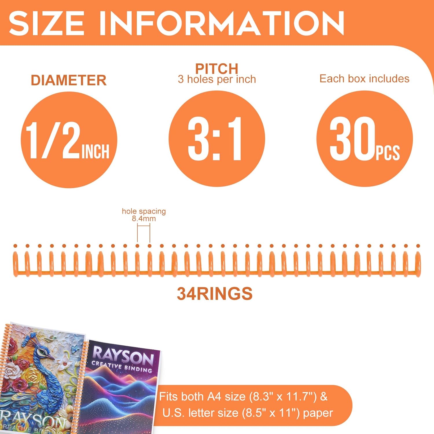 Rayson PROC1230OR Click Binding Spines, 3:1 Pitch, 1/2" Diameter, 90 Sheets Binding Capacity, Orange, 30/Box