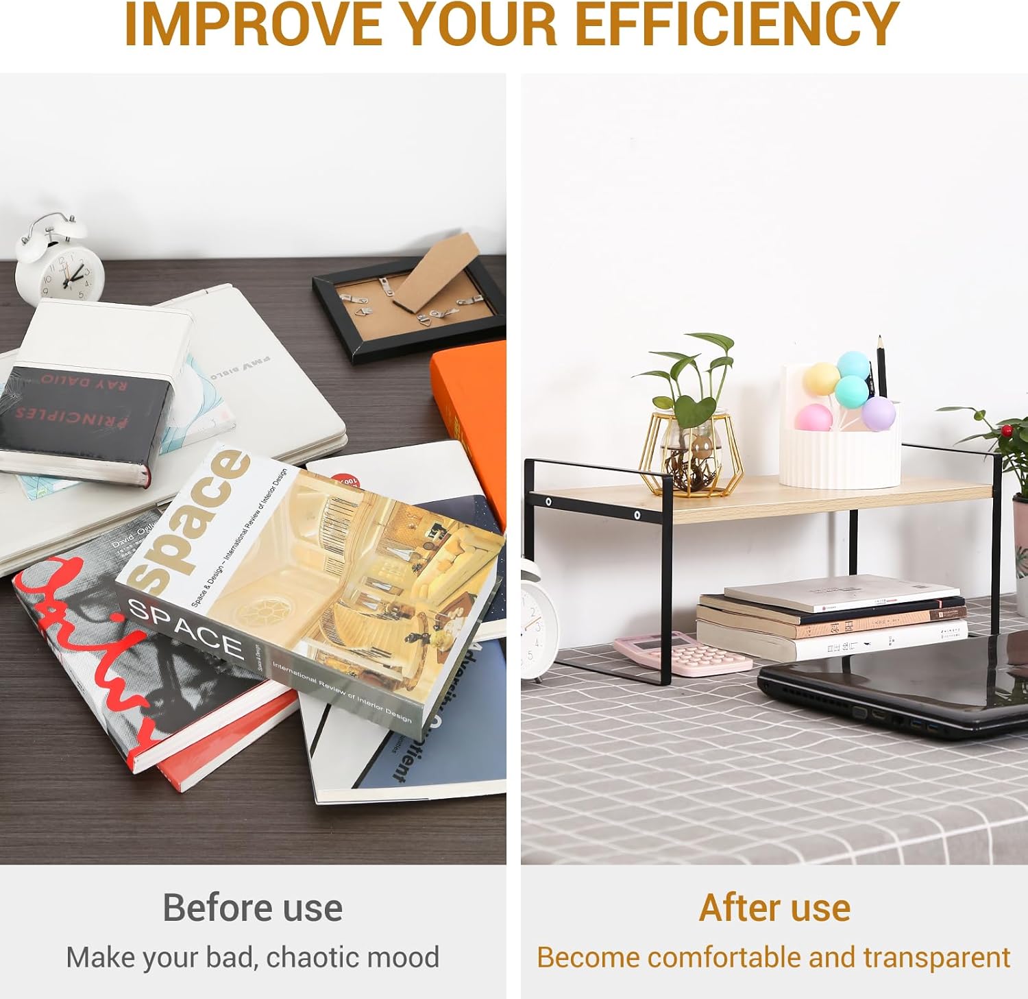- 1.High-grade material, healthy and durable: Our office desk shelf organizer and accessories are made of high-grade wood material, which is stronger than traditional wood, even if there are hollow patterns on both sides, the desktop shelf will not reduce the strength of the shelf. No paint is used on this office desk shelf organizer and accessories, let you have a healthy working and living environment