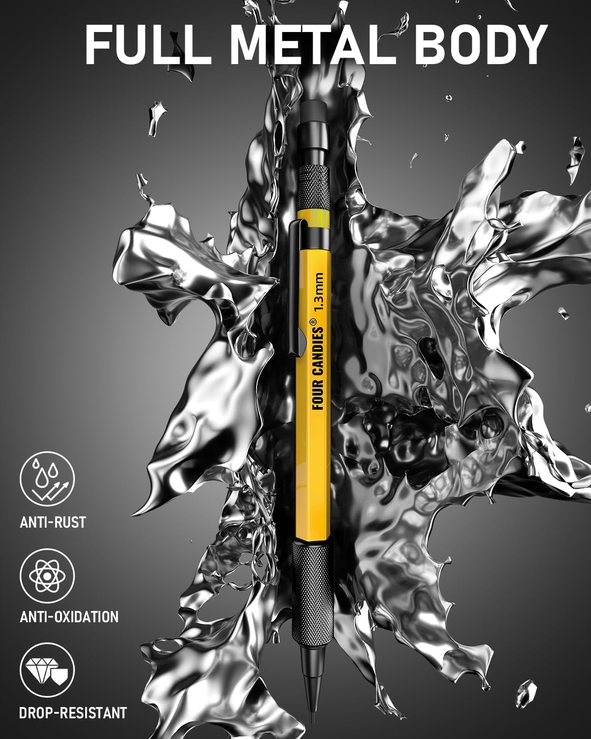 Four Candies 3PCS 1.3mm Mechanical Pencil Set with Case, Metal Heavy Duty Carpenter Pencils with 72 Refill(Red,Black,Yellow) 3Eraser, 16Eraser Refill, Weatherproof Body Outdoor Woodworking Marking