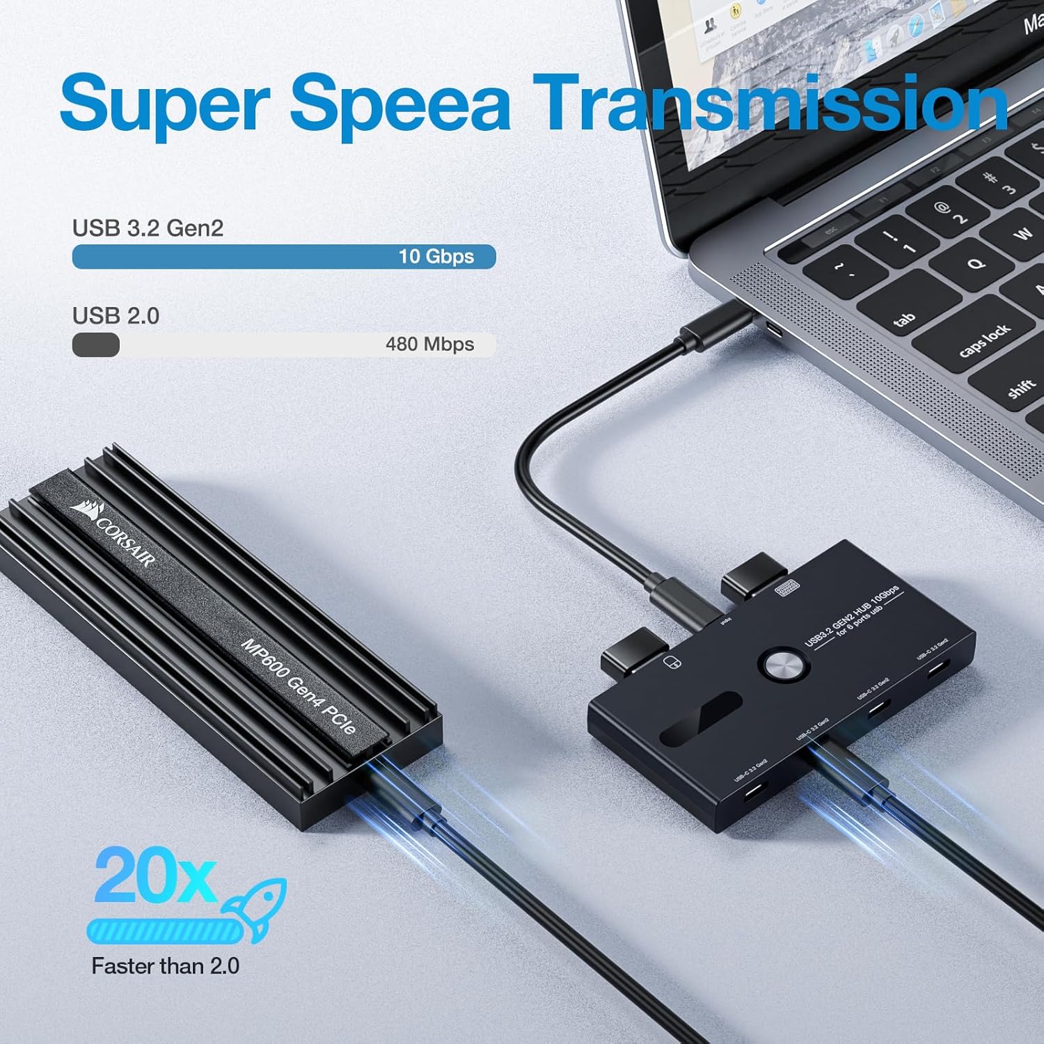 - 【10Gbps】 Fully supports USB3.2 GEN2 specification, Type-C port transmission rate can reach up to 10Gbps, suitable for various Type-C interface devices, especially for devices with high demand for transmission rate such as Portable SSD, etc. can achieve the maximum performance on this HUB.