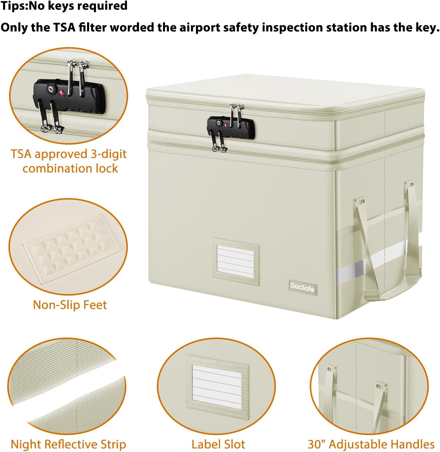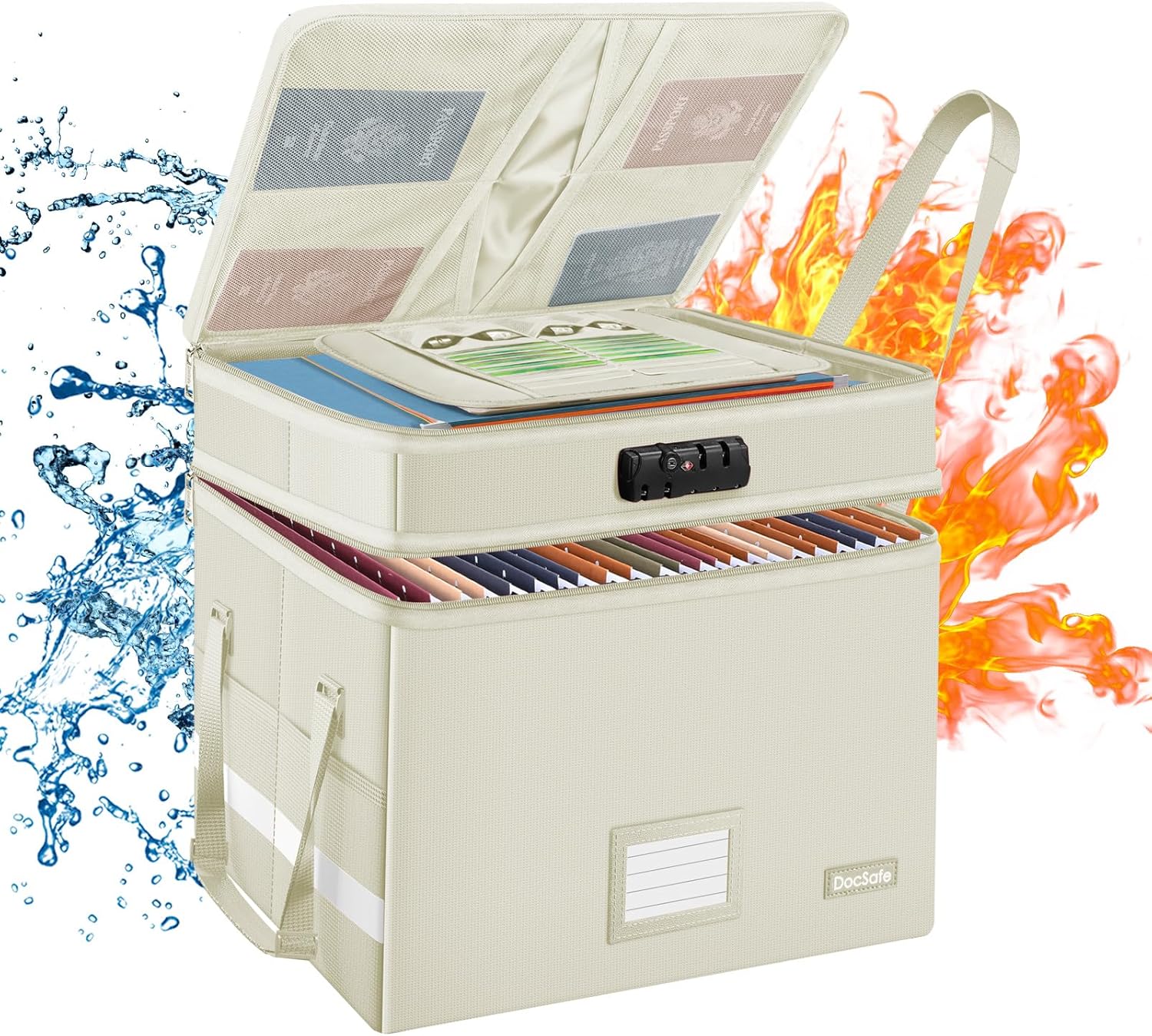 DocSafe File Box with Lock,Multi-Layer Fireproof Document Box Collapsible File Storage Organizer with Pockets/Handle,Large Portable Home Office Filing Box for Hanging Letter/Legal Size Folders,Beige
