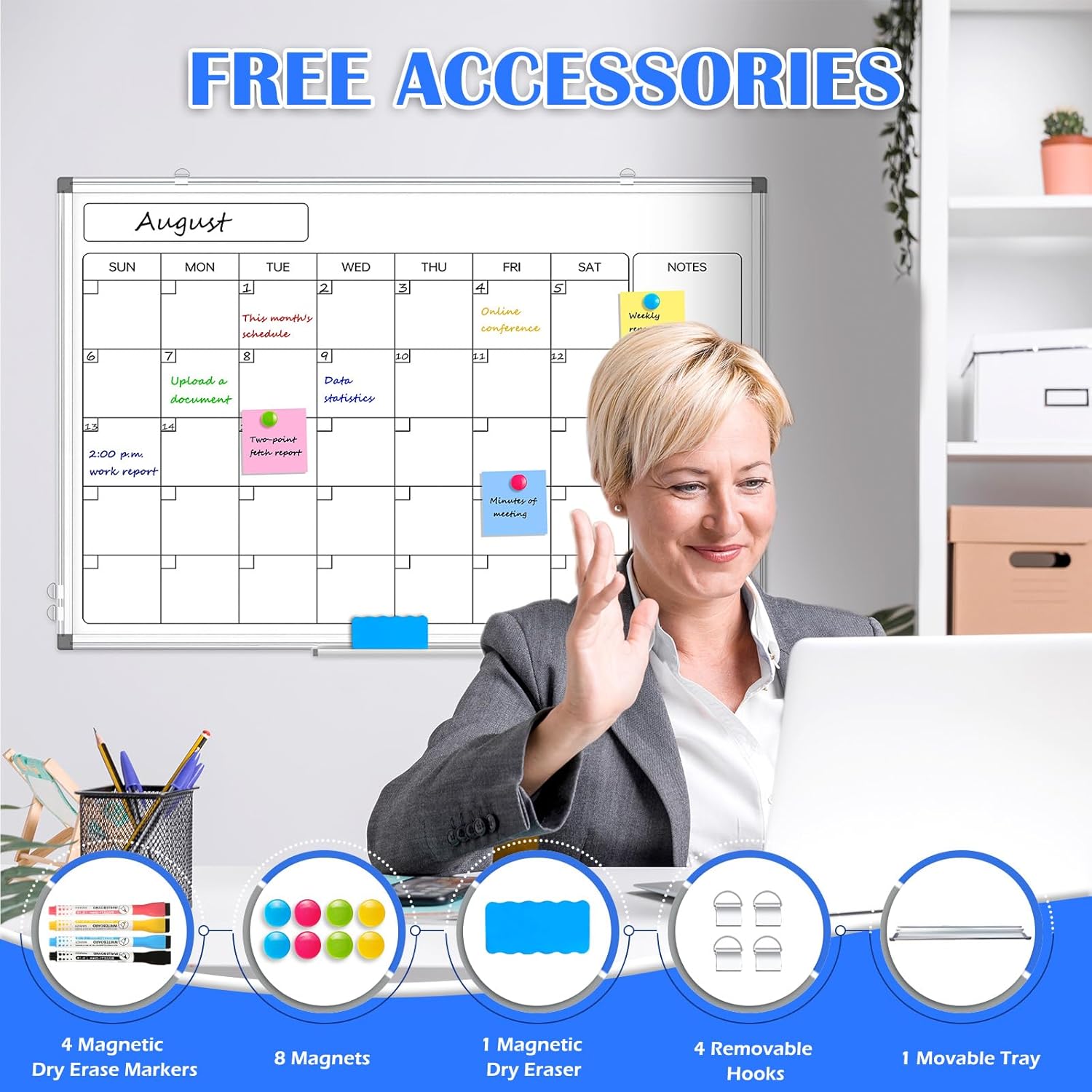 - 【Double-Sided Calendar White Board】: Our monthly whiteboard can put your life in order and plan ahead. Magnetic dry erase calendar board is perfect for pinning notes, messages, pictures, memos, calendars, menus, reminders and more. The magnetic double-sided whiteboard allows you to have two projects going. The other sided is blank. It is the best tool for home teaching or memo.