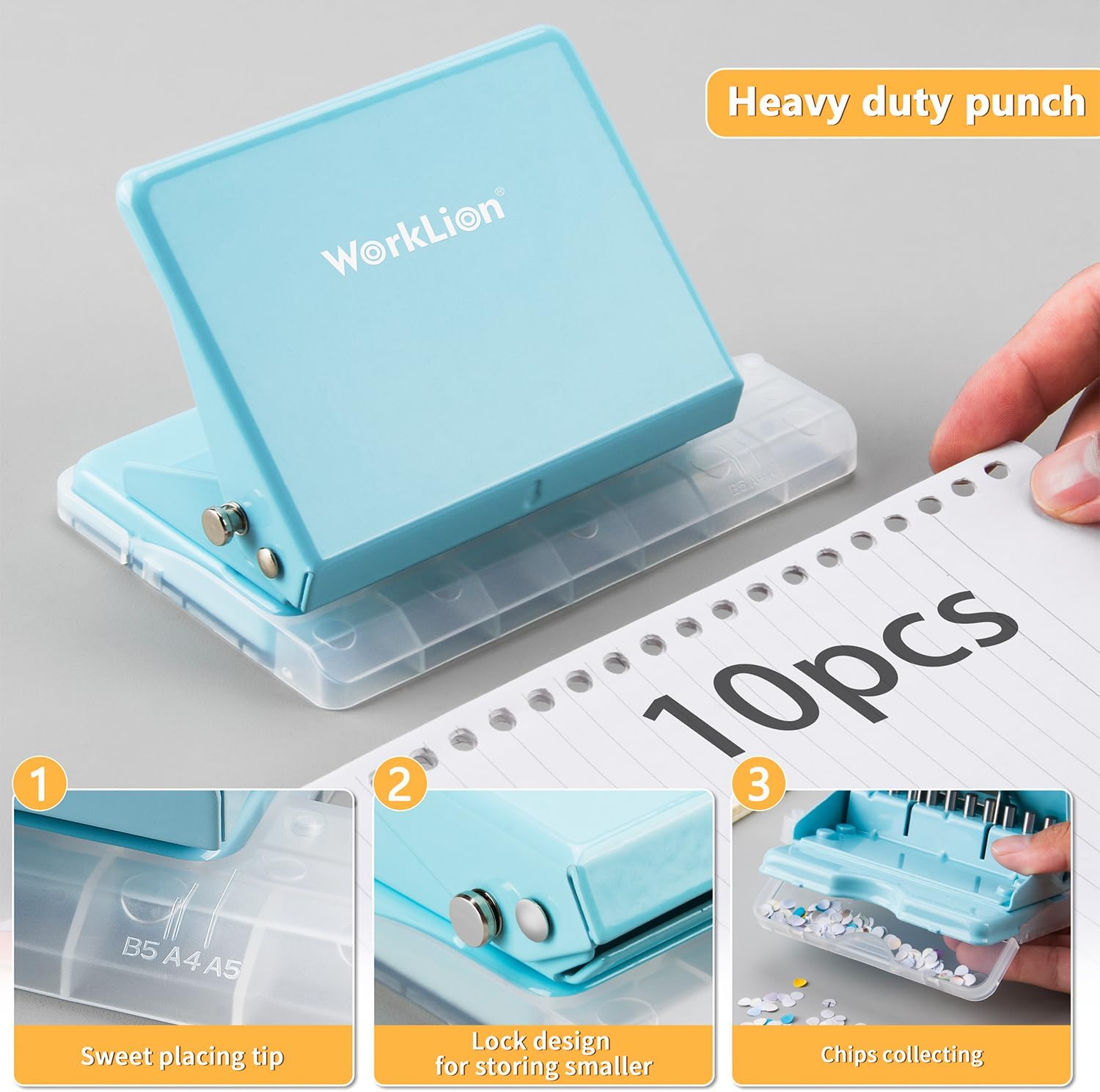- 【10 Hole Punch Binding Machine】Worklion Binding Machine is a metal housing 10 hole punch, a great replacement for 26 hole punch on B5 , 30 holes on A4 and 20 hole punch on A5, 29 holes on letter size. With sharp punching head, it can easily punch 5 sheets a time with the clear holes , maximum 10 sheets if pressing at the edge. Ideal for punching planners,journals,notebooks,recipe,laminated sheets,report and refilling paper in binder files.