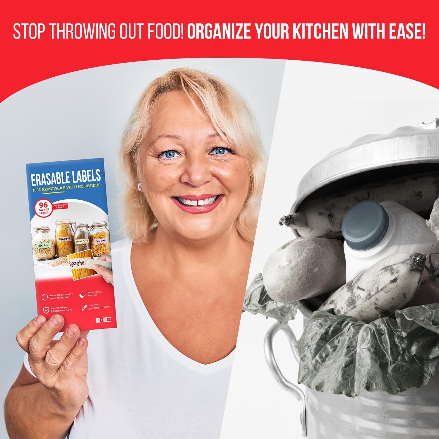- Multipurpose – Your erasable and removable blank stickers work great for labeling meal prep containers, canning labels, mason jar labels, or organization in the fridge. Way better than freezer tape! Eraser and Marker not included. Help the Environment – Accurate labeling helps keep old fridge food, drinks, and containers out of the landfill. These kitchen labels for containers also keep harmful cleaners out of the drain!