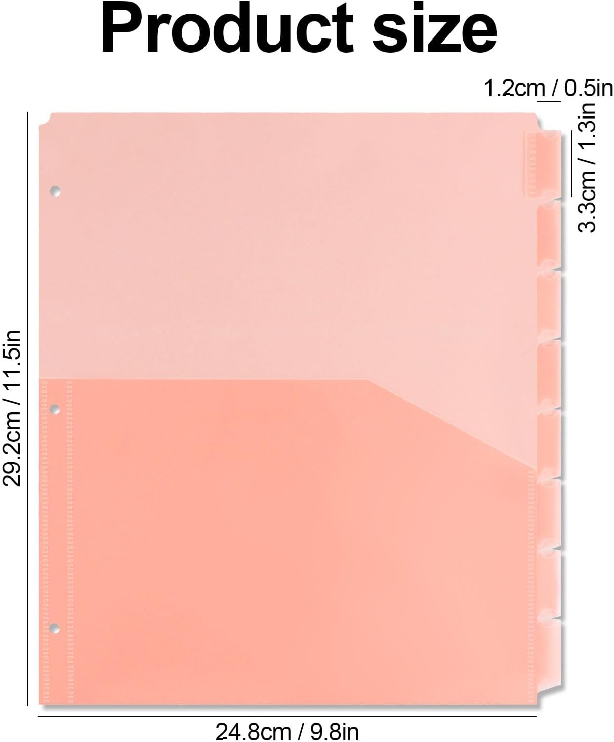 - 【Fits 3 RIng Binders】3 Holes punched, fit in 3 ring binders. Our Plastic Pocket Dividers are measured 9.8 x 11.5 inches, providing the maximum coverage for your letter-sized paper. There are a total 3 sets of 8 dividers for 3 ring binder with pockets in the package.