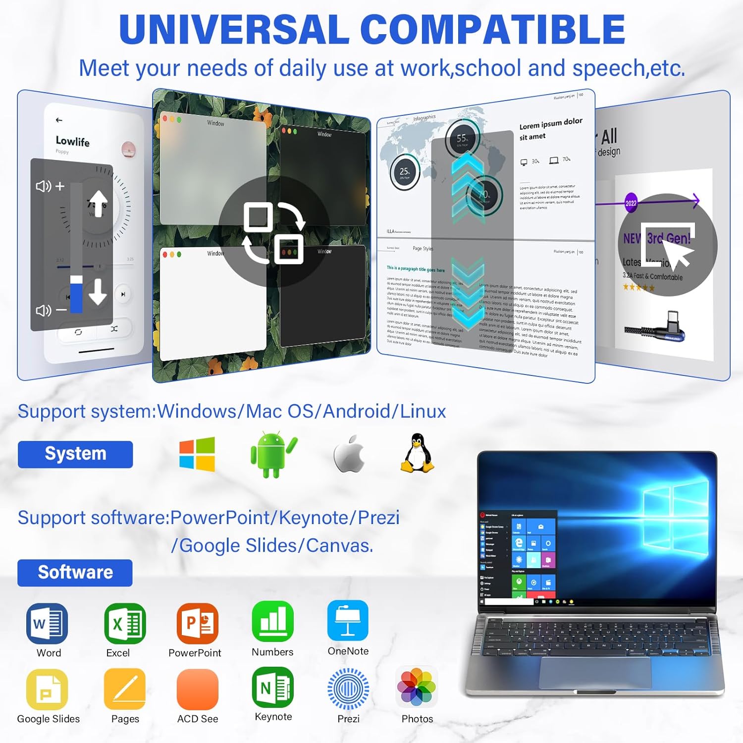 - Compatible Devices : Mac OS, Macbook, Chromebook, Windows, Linux, Android, HP, Lenovo, Surface Microsoft, PC, Desktop, Computer, Laptop, Projector Screen, MS Word, Excel, PowerPoint, Google Slides, Prezi, IWORK, Keynote, etc. Mac OS, Macbook, Chromebook, Windows, Linux, Android, HP, Lenovo, Surface Microsoft, PC, Desktop, Computer, Laptop, Projector Screen, MS Word, Excel, PowerPoint, Google Slides, Prezi, IWORK, Keynote, etc.