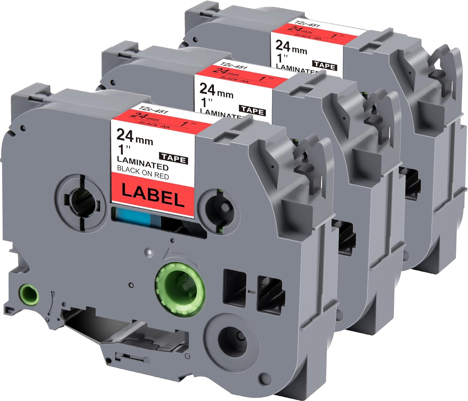 Weemay 3 Pack TZe451 24mm Black on Red Laminated Label Tape Compatible with Brother Label Maker Tape TZe-451 TZe 451 TZ-451 TZ451 for PTouch PT-E500 PT-D600 PT-P750W PT-P900W Printer, 1 in x 26.2 ft